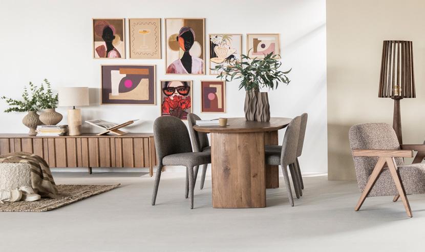 Het is zonder twijfel de warmbruine houttint die zorgt voor rust, warmte en balans in dit interieur. Door te kiezen voor meubels uit verschillende series, ontstaat er een spannend geheel waar qua vorm en design van alles gebeurt. De terugkerende houttint zorgt juist voor het mooie geheel. Aangevuld met stoffen in verschillende tinten en texturen voeg je de juiste dosis comfort toe.