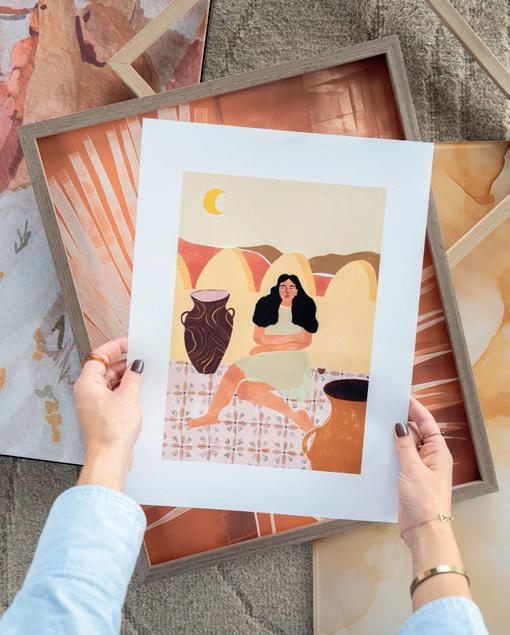In deze set mixten we een reeks warme en diepe aardetinten met elkaar. De naturel houten lijsten zorgen voor eenheid.