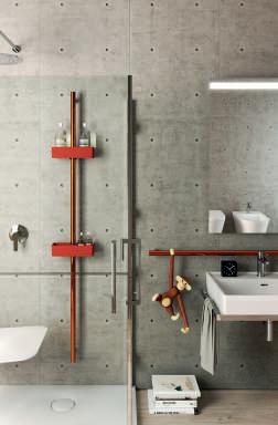 The grab bar is conceived as a constant element in the bathroom space, aimed not only and exclusively to “safety“, therefore as a handhold, but also as a support for various elements such as a mirror, a piece of furniture or a shelf. In this way it becomes a structural element that allows you to arrange the space as you wish.
