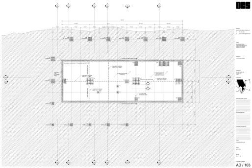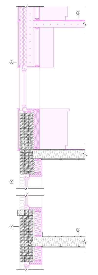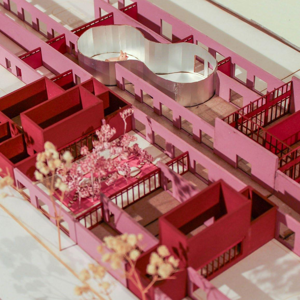 Several thick pink CMU walls are stretched across the site, continuing pre-existing lines of structure. Larger gaps between these walls are flexible spaces with varied elevational relationships. These are supported by smaller service spaces that might contain kitchens or workshops. Portals are cut into these walls as a means to allow for rooms to bleed free-