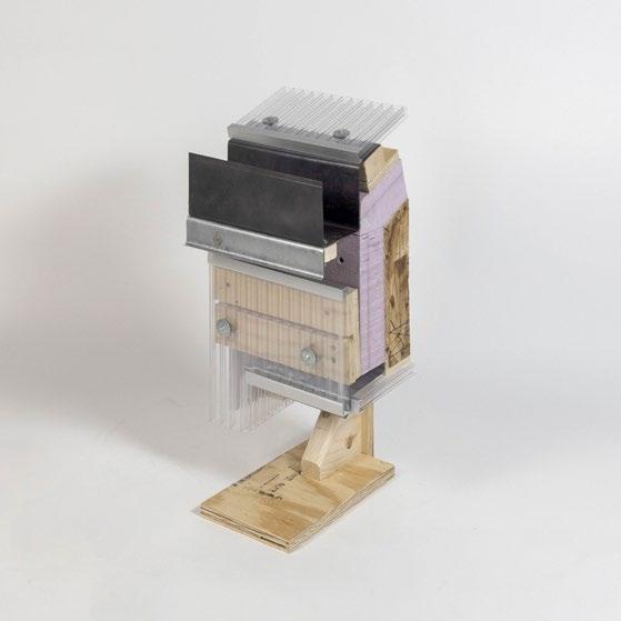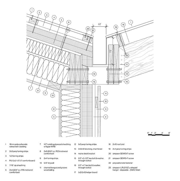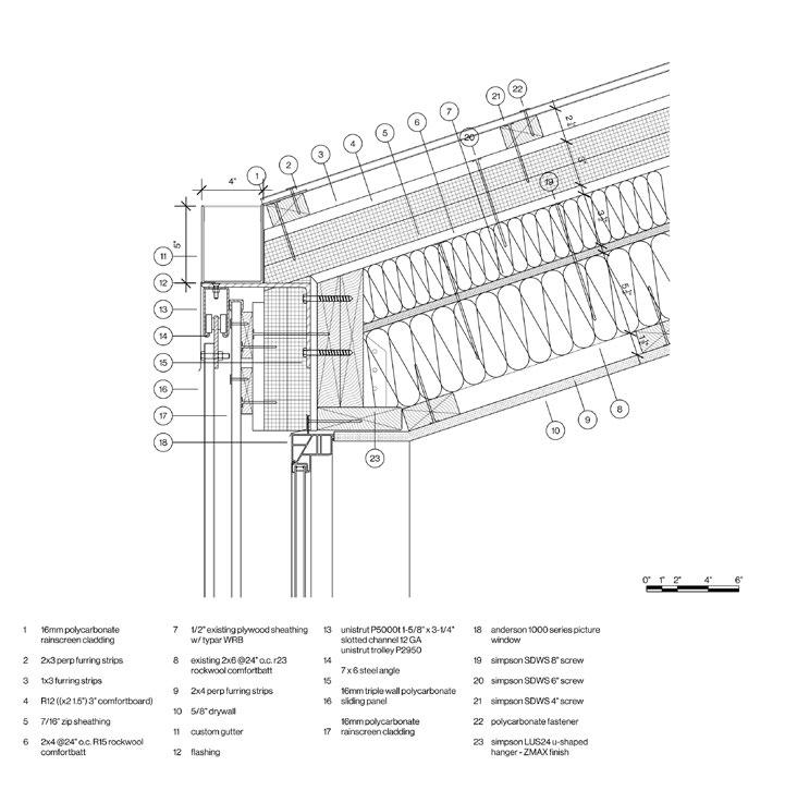 Polycarb House maintains the original structure’s pitchedroof form, but is clad in a polycarbonate shawl. This rainscreen cladding system is an exploration into emerging building technology and is one of the first in New York state. It’s interiors register the the pitched roof form, allowing for a series of program bars (wet, circulation, living) to share the same cathedral ceiling condition.