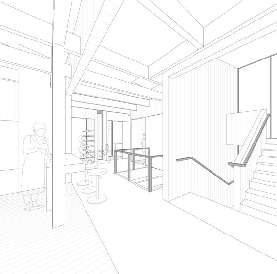 ly into one another. Partitions are positioned transverse to the walls and are materially porous/transparent, used to define boundaries for program. A glimmering aluminum bean materializes within and disrupts this system as a means to ground one’s self in plan.
