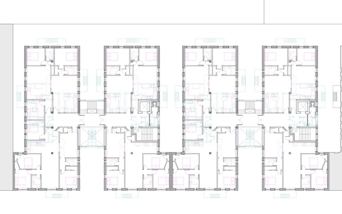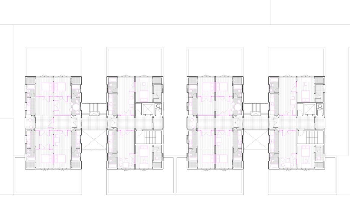 While the massing was driven primarily by zoning and natural ventilation strategies , the earlier housing prototypes were primary design drivers in the development of the project in plan. Service space is pushed to edges of the envelope with poor day-lighting, allowing for multiple apartment configurations in the space left over.