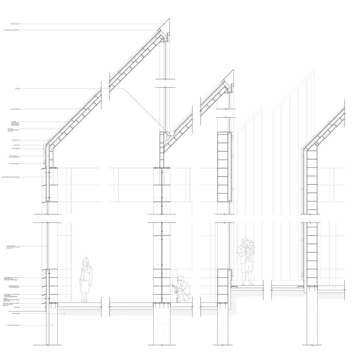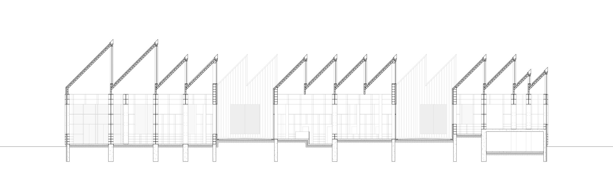 Atop the spiral wall lies a saw-toothed roof, an independent system that addresses daylighting concerns. This secondary system is distinct from the latticed load-bearing walls in aesthetic and construction, opting for a white painted waffle-sandwich steel structure. This allows for diffuse northern light to provide consistent lighting conditions in deeper layers of the spiral. Sawteeth are sized according to the lighting needs of the program conditions beneath them - lobbies have larger teeth than hallways or administrative space. Two courtyards sit at the innermost portions of the plan - these are instances where this system folds inwards, allowing for bright anchor points within the plan.