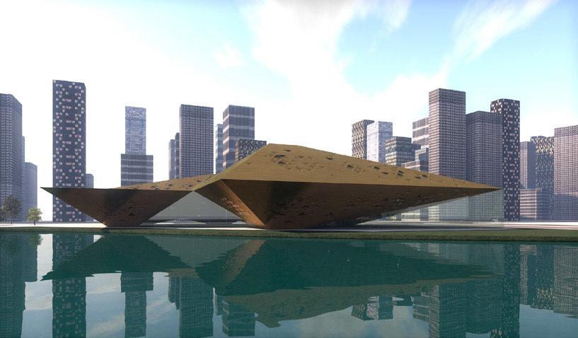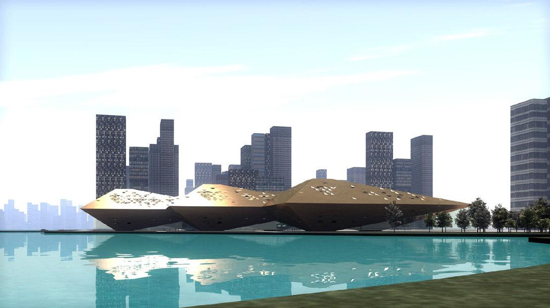 li, ci confondono. Quando sono disposte in senso orizzontale, la loro forma “femminile” ci coinvolge e ci invita. Se aumentiamo la loro dimensione a scala architettonica diventino una costruzione che ci permette di penetrare all’interno, salire sulla copertura, sfiorare la sua superficie liscia e sinuosa. Il progetto presenta un fascio di lame giustapposte di forma emi-simmetrica, che emergono dal terreno sfalsate una sull’altra.