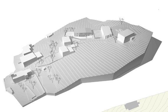 Le accentuate pendenze del terreno e la forte differenza di quota con la Strada del Vino hanno suggerito la soluzione per la distribuzione delle diverse funzioni nel lotto, il nuovo manufatto si adagia sul terreno riducendo al minimo le operazioni di scavo necessarie a causa del declivio naturale.
