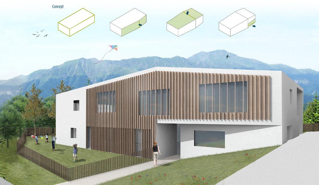Il nuovo edificio della scuola d’infanzia si inserisce sul lato sud-ovest dell’area di progetto con l’intenzione di consolidare, in questo