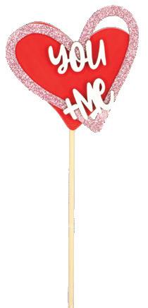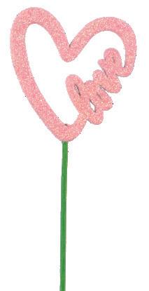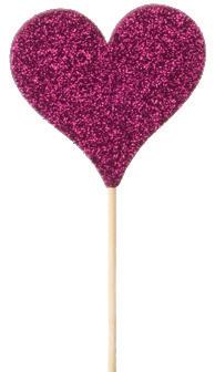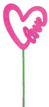 So In Love Heart Pick. Glittered. Wood. Heart: 31/4"H, 3"W. Overall: 20"H. Hot pink, pink, and red. Bag of 10. S813
