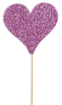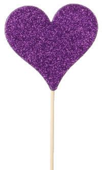 Heart Pick Assortment. Glittered. Wood. Top: 3"H, 3"W. Overall: 21"H. Purple, light pink, and fuchsia. Bag of 12. S27827