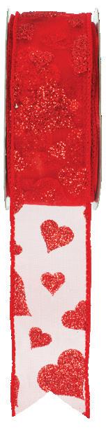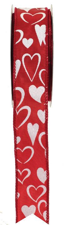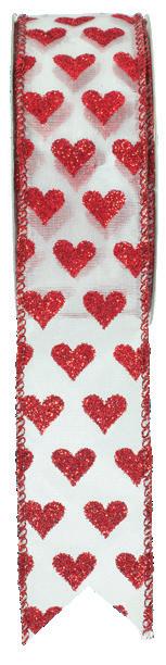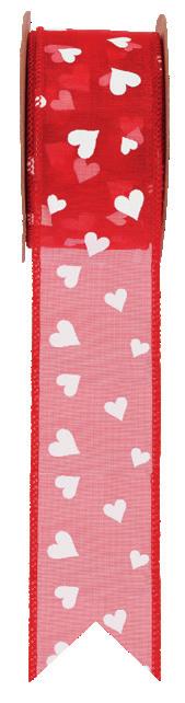 Tossed Hearts Ribbon. #9. Wired. Sheer Polyester. 50 yards. Red and white.