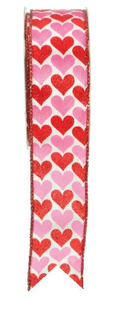 Satin Hearts Ribbon. #9. Wired. Glittered. Sheer Polyester. 50 yards. Multicolor.