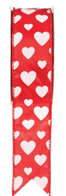 Satin Hearts Ribbon. #9. Wired. Polyester. 50 yards. Red and white.