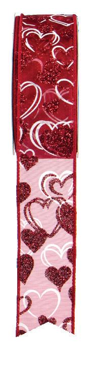 Sheer Solid Hearts Ribbon. #9. Wired. Glittered. Sheer Polyester. 50 yards. Red.