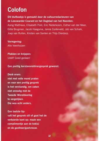 Colofon Dit blufboekje is gemaakt door de cultuurredacteuren van de Leeuwarder Courant en het Dagblad van het Noorden: Asing Walthaus, Elisabeth Post, Eric Nederkoorn, Esther van der Meer, Gitte Brugman, Jacob Haagsma, Janna Zuiderveld, Job van Schaik, Joep van Ruiten, Kirsten van Santen en Thijs Dierdorp. Vormgeving: Alie Veenhuizen Plakken en knippen: Uzelf! Goed gedaan! Een prettig kerstavonddinergesprek gewenst. Denk erom: niet met volle mond praten en voor een prettig gesprek is het verstandig, om zaken niet onnodig met de Tweede Wereldoorlog te vergelijken. Die was echt anders. Een laatste tip: valt het gesprek stil of gaat het de verkeerde kant op: maak een complimentje aan de kok(s) en de gastheer/gastvrouw. 32