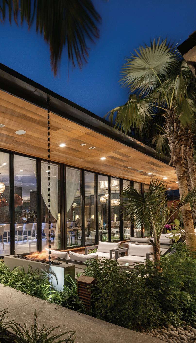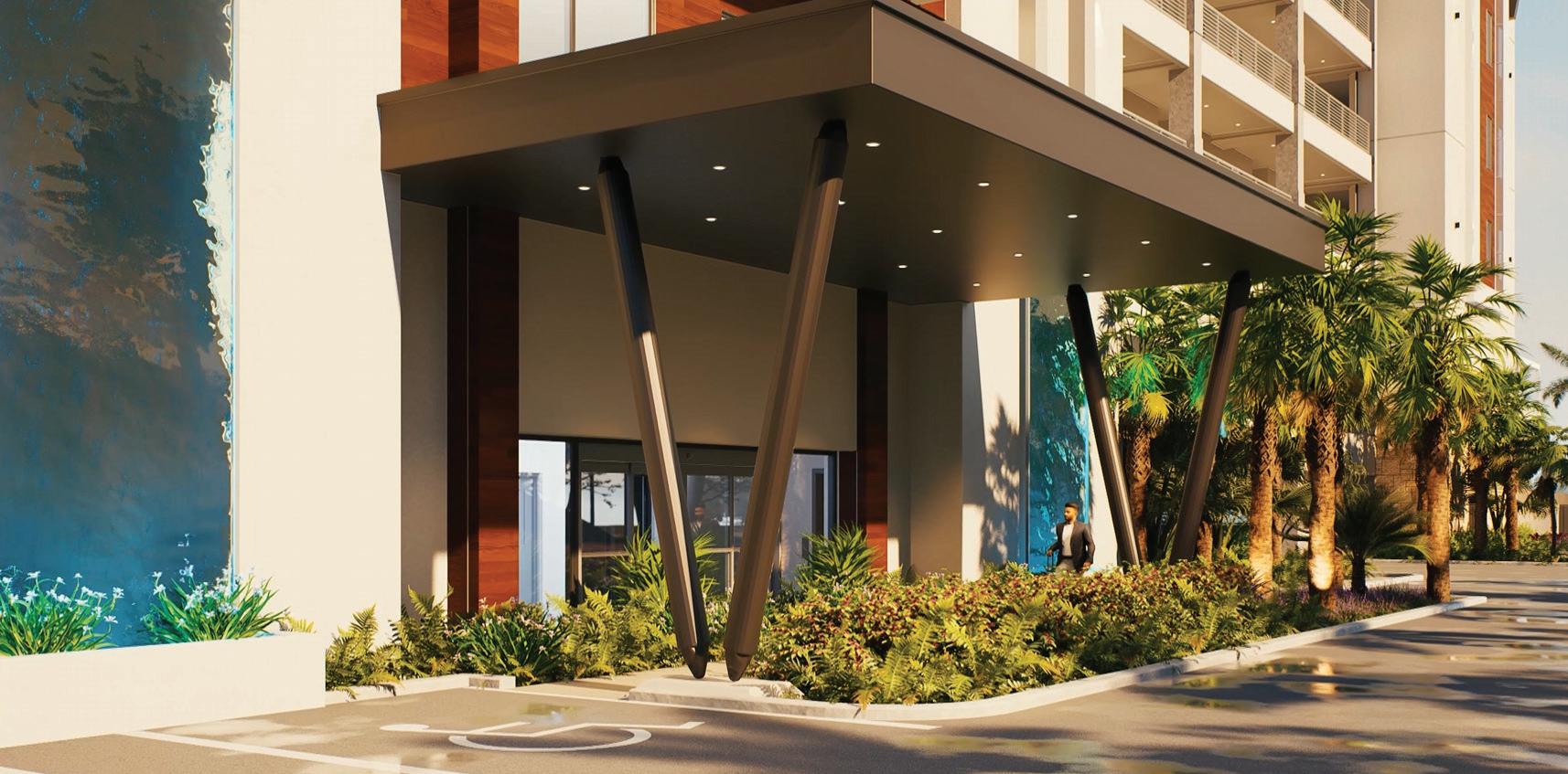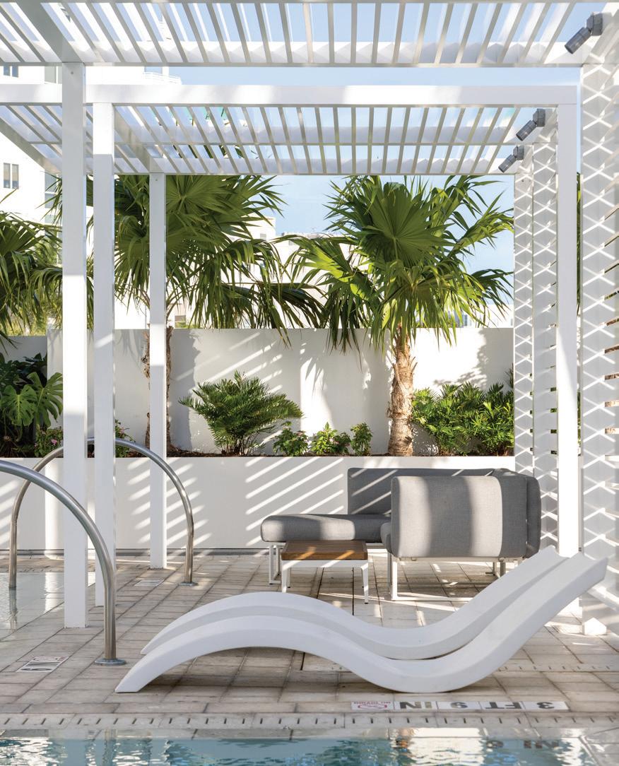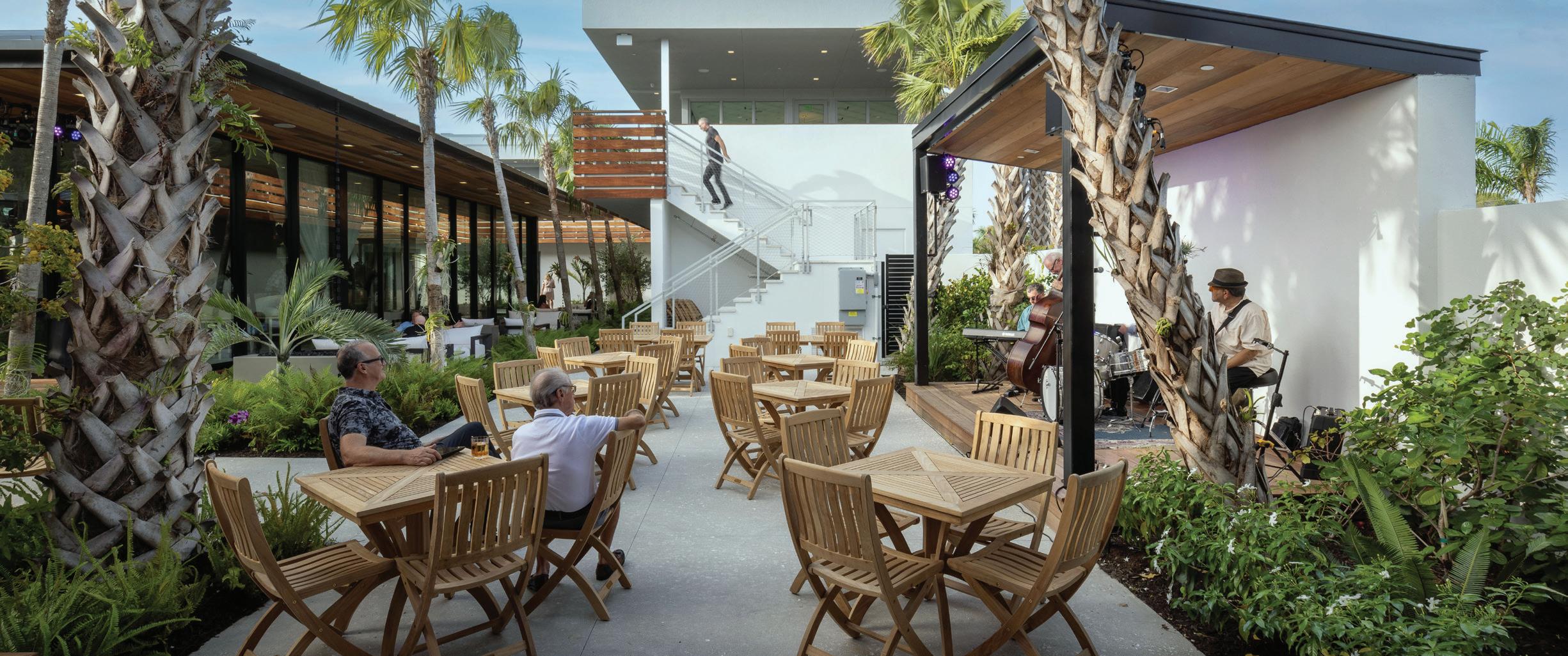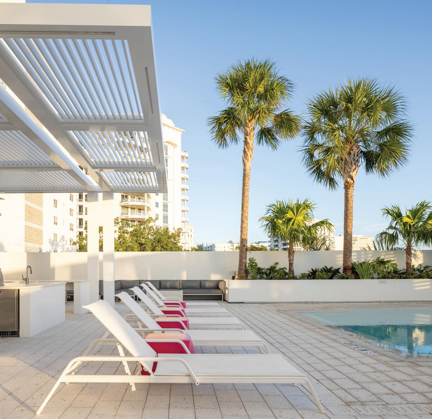 The project’s minimalist design (inspired by the Sarasota School of Architecture) blurs the lines of indoor and outdoor living. The design’s arrival sequence incorporates a streetscape and custom planters at the porte-cochère. The indoor-outdoor experience continues through the thirdfloor pool deck with custom pergolas and seating arrangements that support both flexible, communal, or private gatherings and then extends to the rooftop terrace where residents can enjoy sunset views over Sarasota Bay.