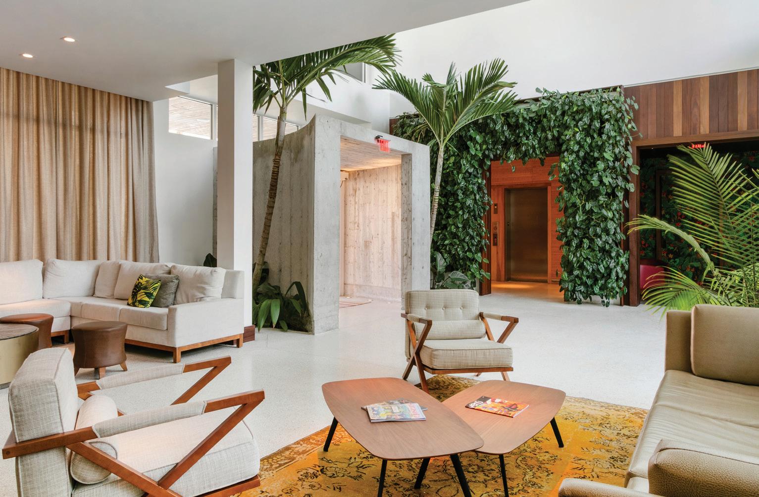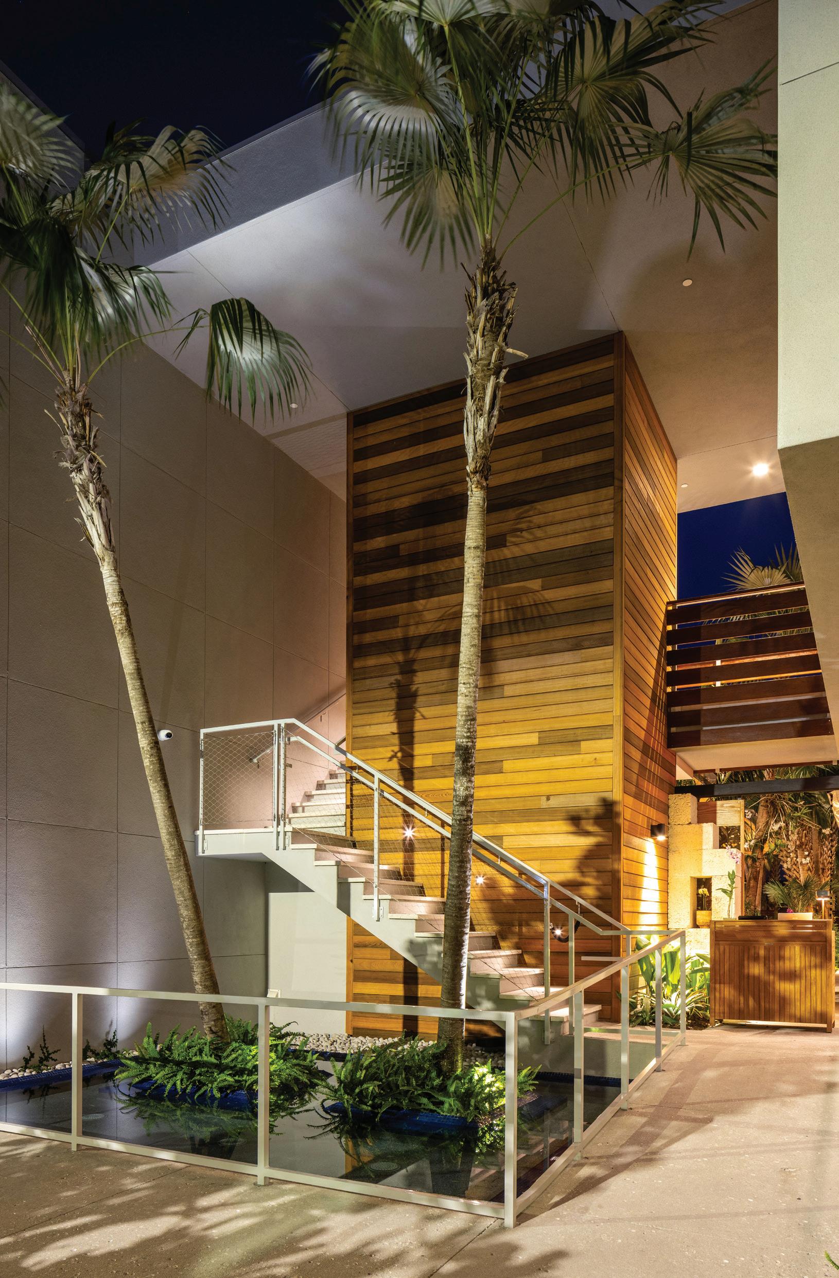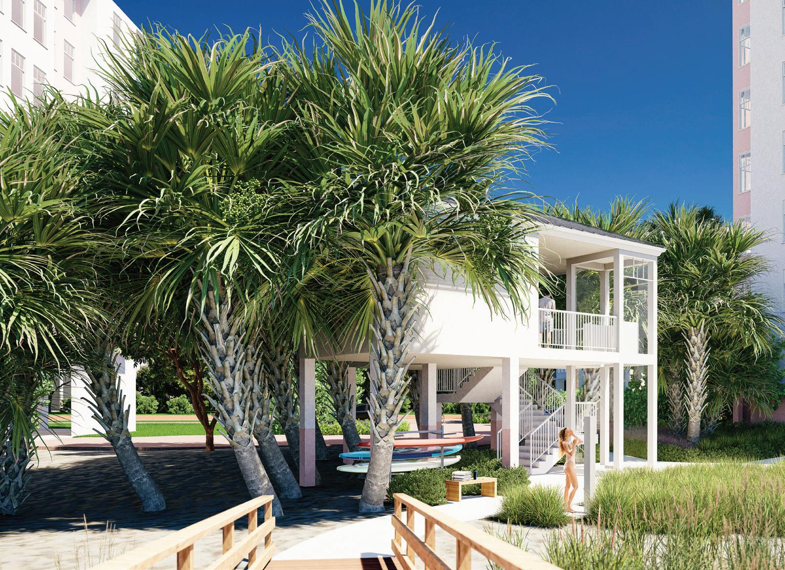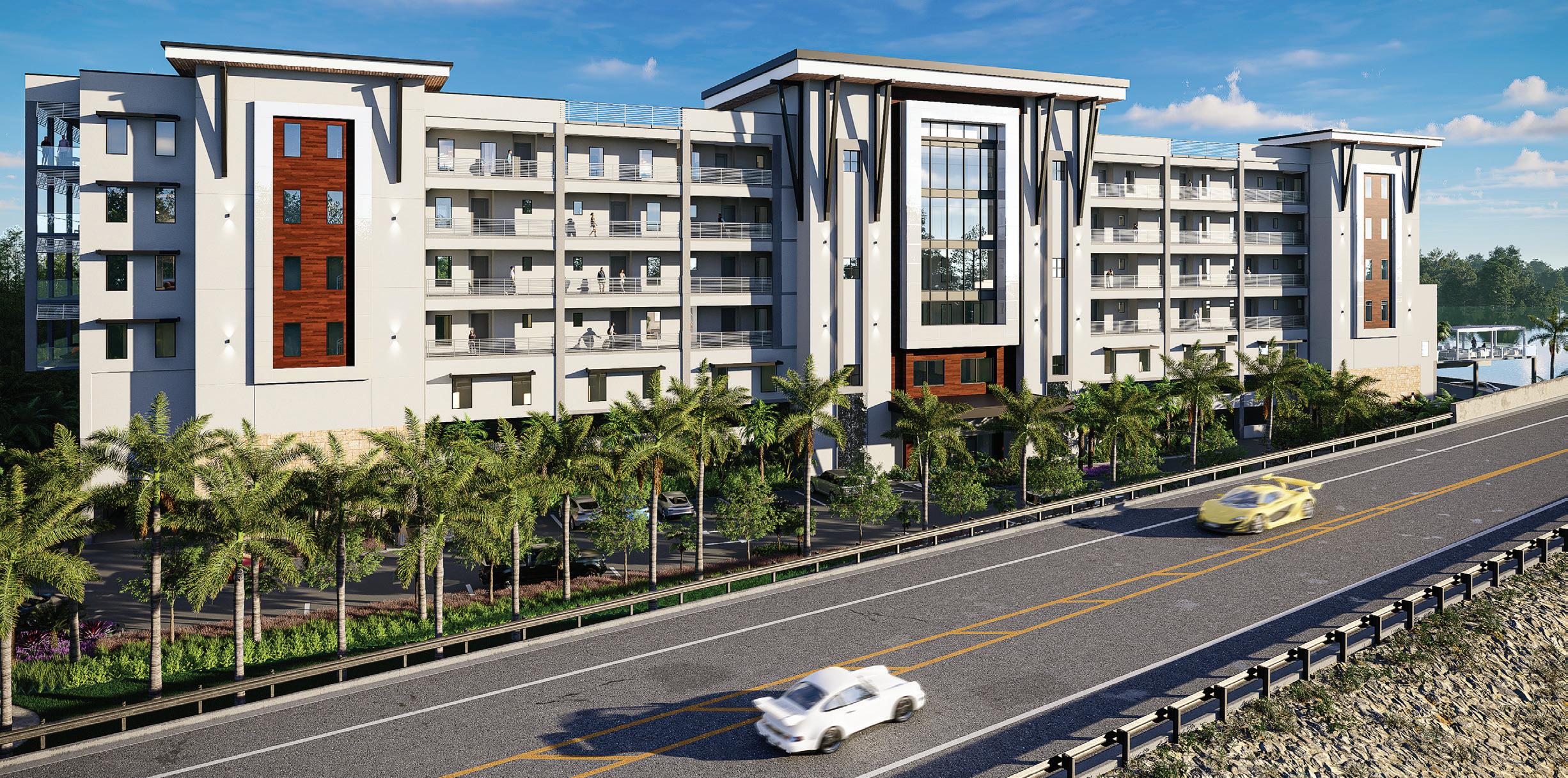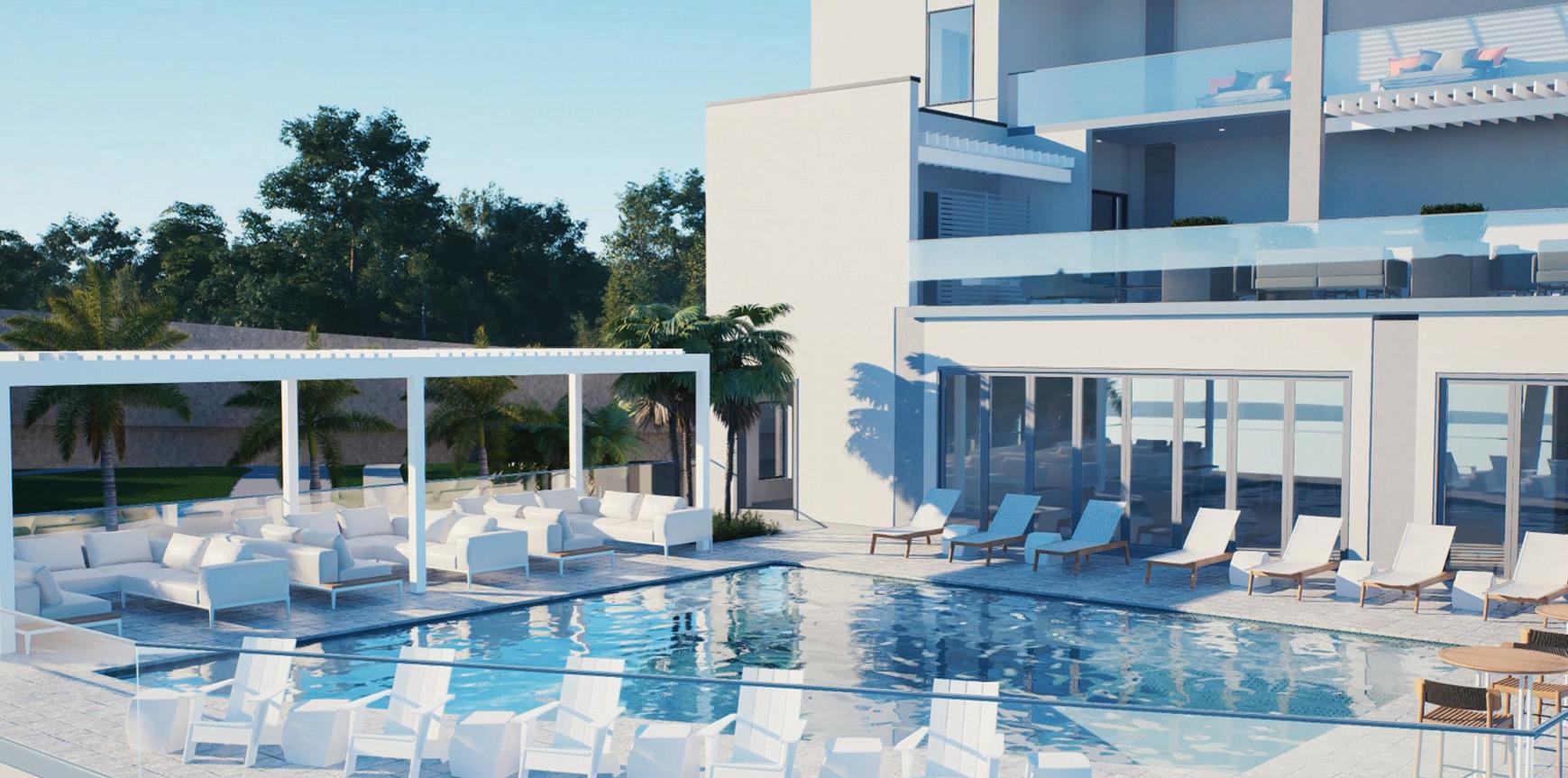 The project’s minimalist design (inspired by the Sarasota School of Architecture) blurs the lines of indoor and outdoor living. The design’s arrival sequence incorporates a streetscape and custom planters at the porte-cochère. The indoor-outdoor experience continues through the thirdfloor pool deck with custom pergolas and seating arrangements that support both flexible, communal, or private gatherings and then extends to the rooftop terrace where residents can enjoy sunset views over Sarasota Bay.