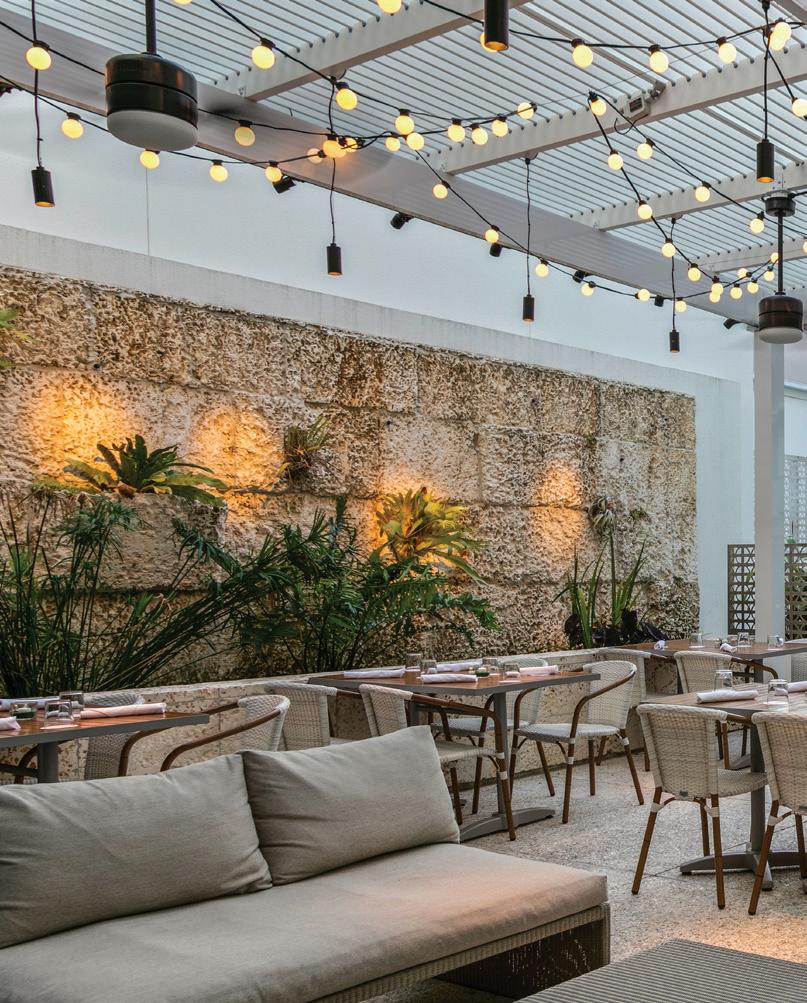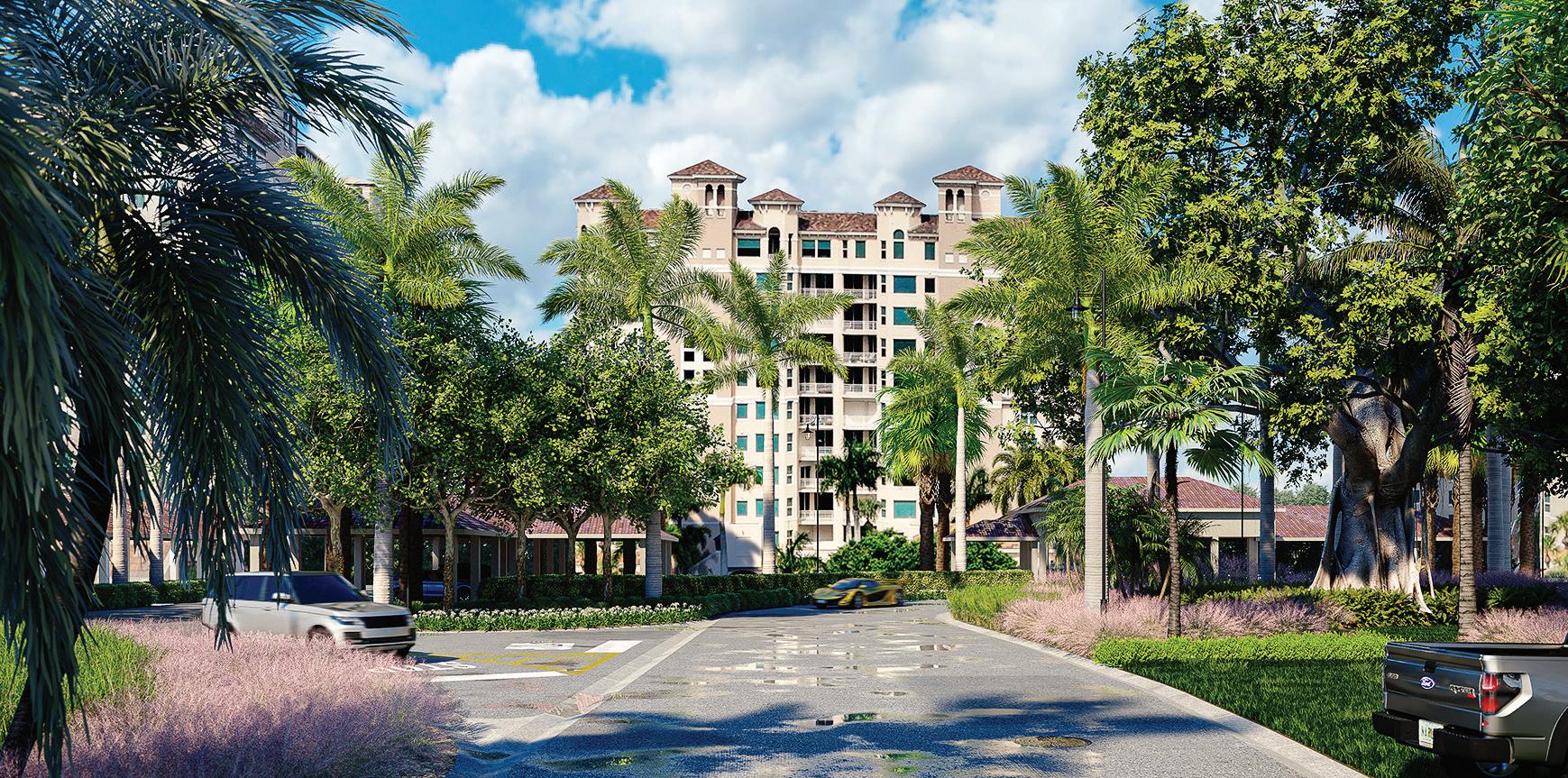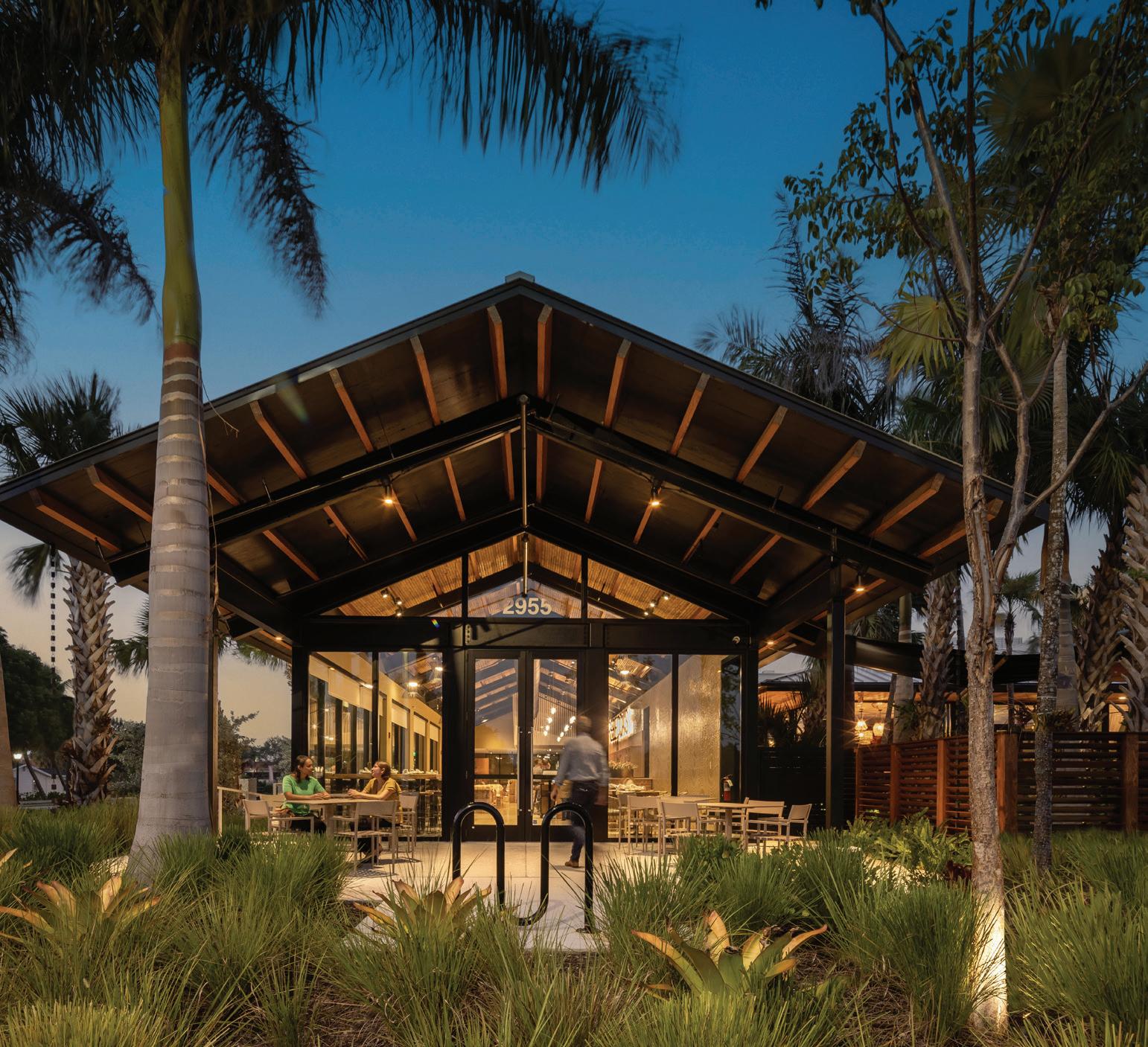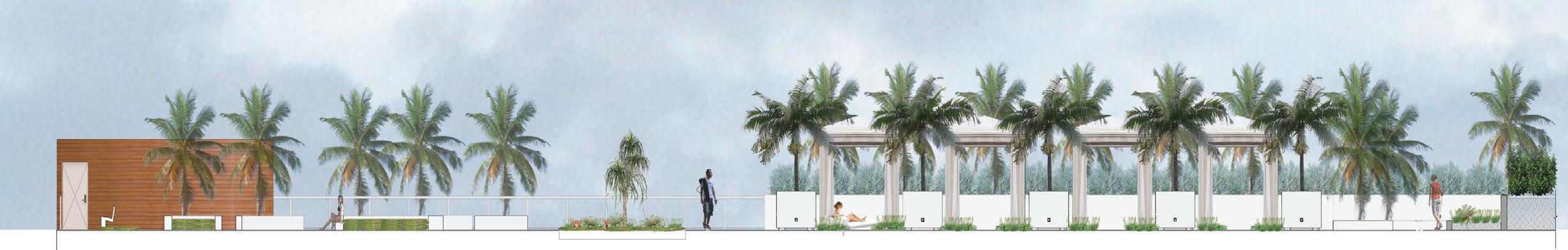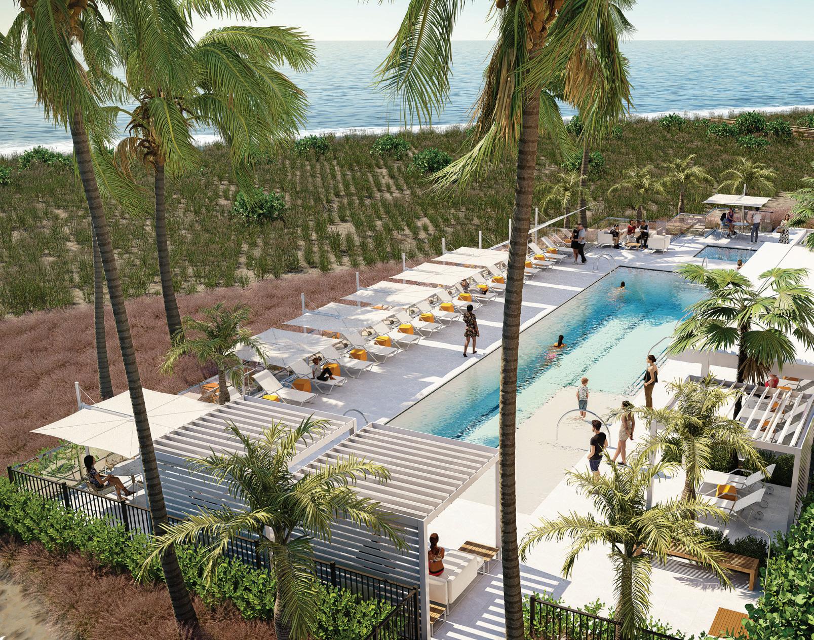The project’s minimalist design (inspired by the Sarasota School of Architecture) blurs the lines of indoor and outdoor living. The design’s arrival sequence incorporates a streetscape and custom planters at the porte-cochère. The indoor-outdoor experience continues through the thirdfloor pool deck with custom pergolas and seating arrangements that support both flexible, communal, or private gatherings and then extends to the rooftop terrace where residents can enjoy sunset views over Sarasota Bay.