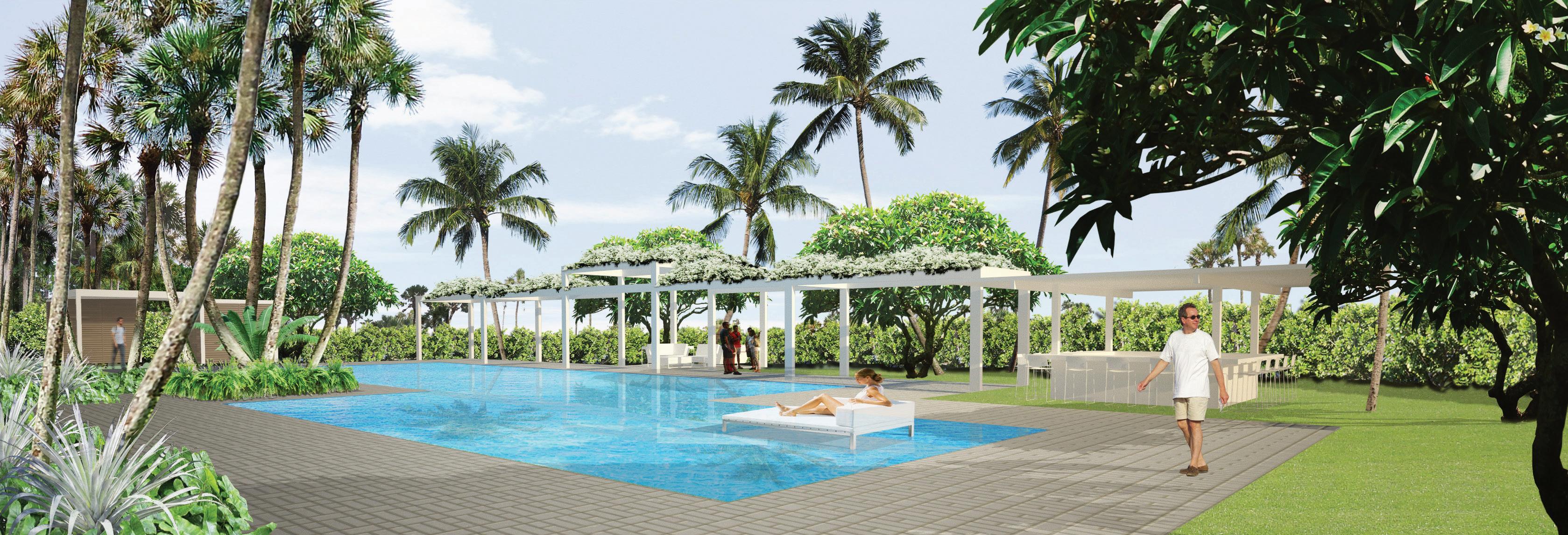 Conceptual Design Rendering | Pool & Recreation Deck with shaded lounges, cabanas, and resort-inspired outdoor living spaces