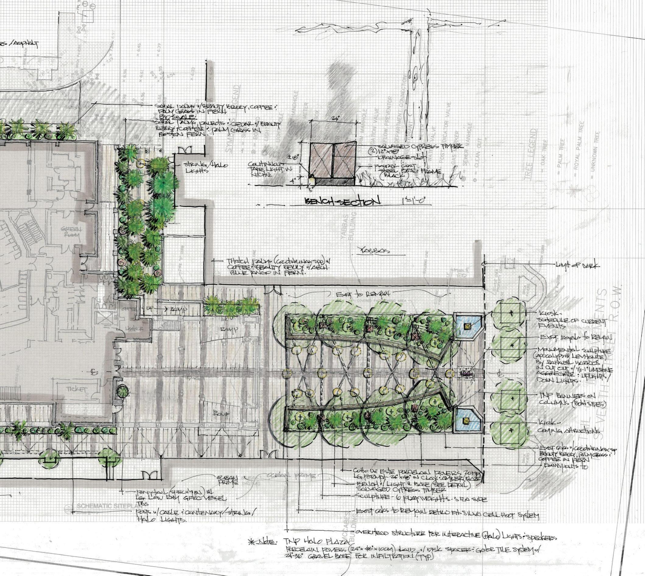 Conceptual Design Rendering | Custom Raw-Edge Benches, Lush Plantings, and Busts of Famous Playwrights Illuminate the Plaza