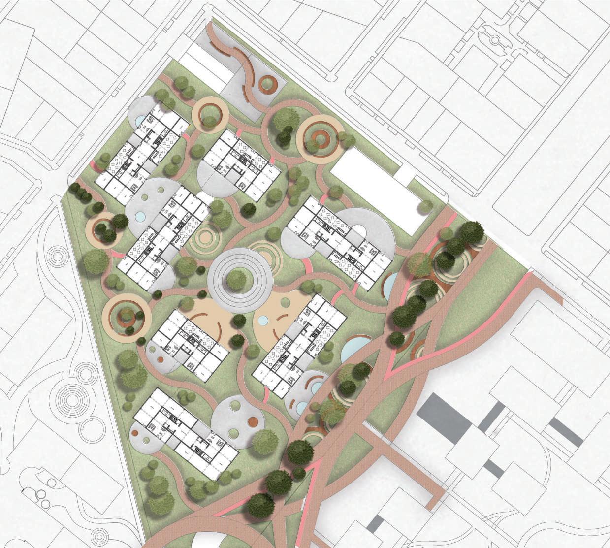 Asimismo la vegetación es importante como arboles existentes y los propuestos y biohuertos propios de cada bloque de edificio, de igual manera se considera el uso de toda la planta baja para un uso comercial y contar con areas comunes.
