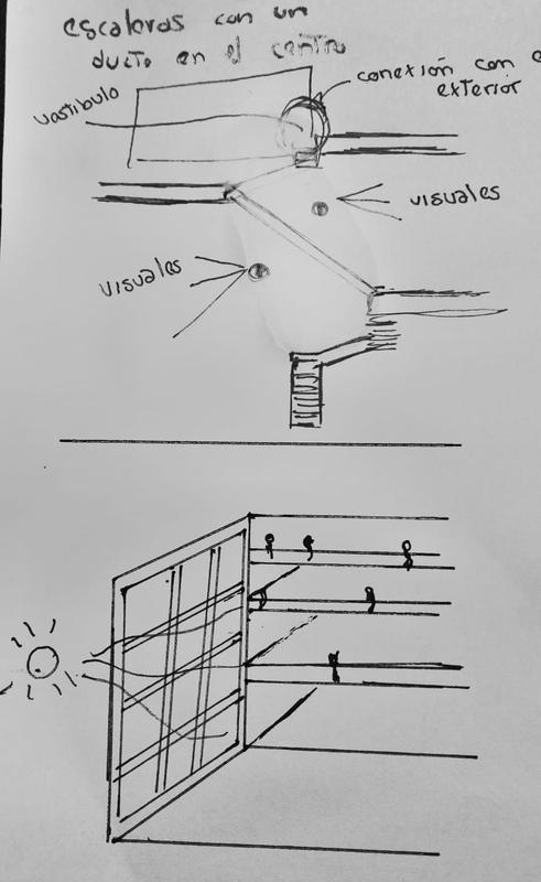 En esta celula se observa que tiene una forma escalonada ,tiene ritmo y repeticion, desde los laterales entra la ventilacion e iluminacion hacia el centro.