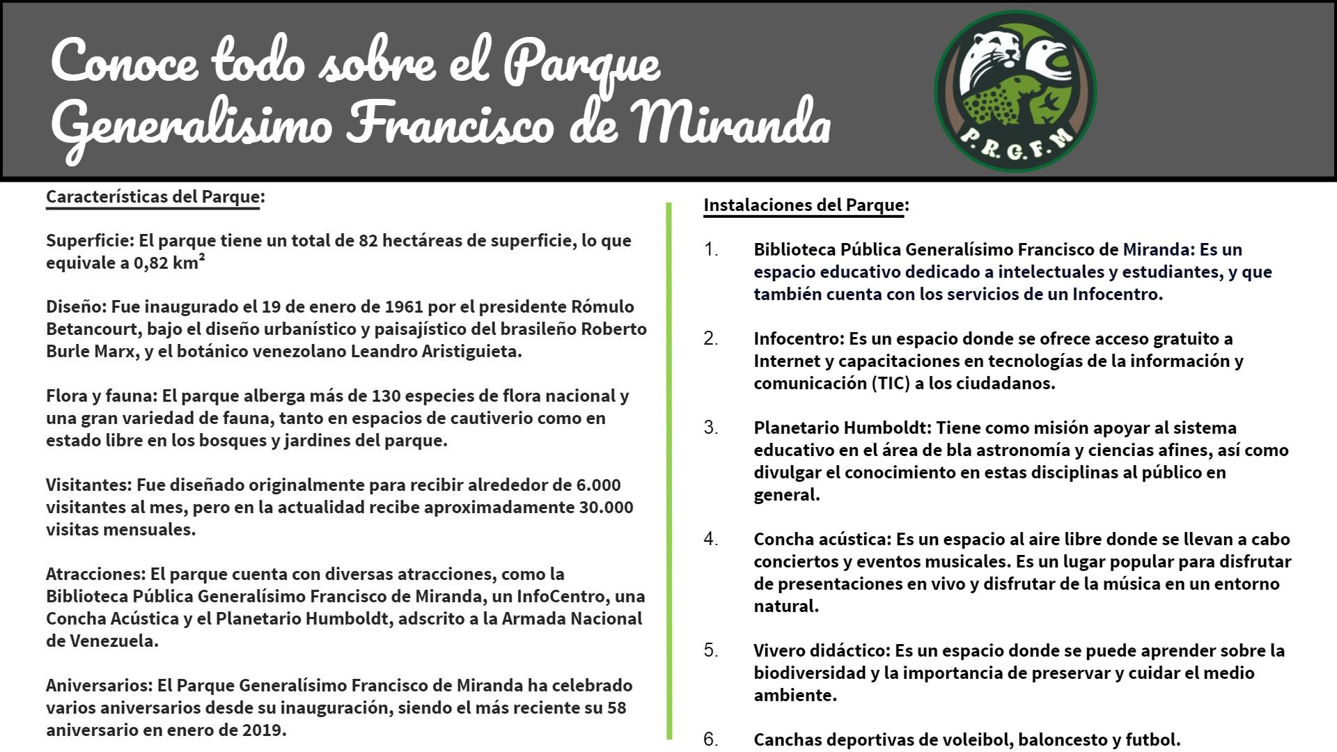 ElParqueGeneralísimoFranciscodeMirandaforma partedelSistemaNacionaldeParquesdeVenezuela yalbergaunagranvariedaddeflorayfauna,tanto encautiveriocomoenestadolibreenlos bosquesy jardinesdelparque.