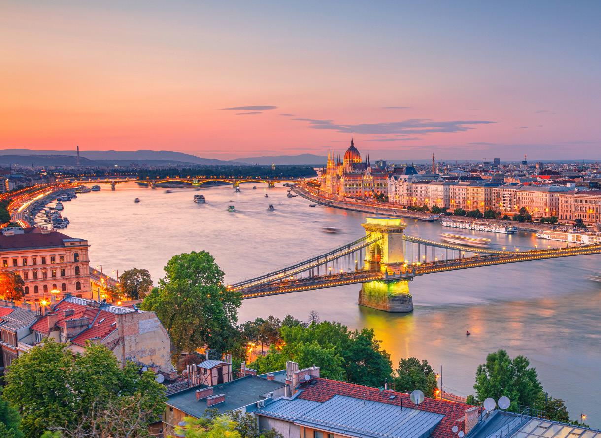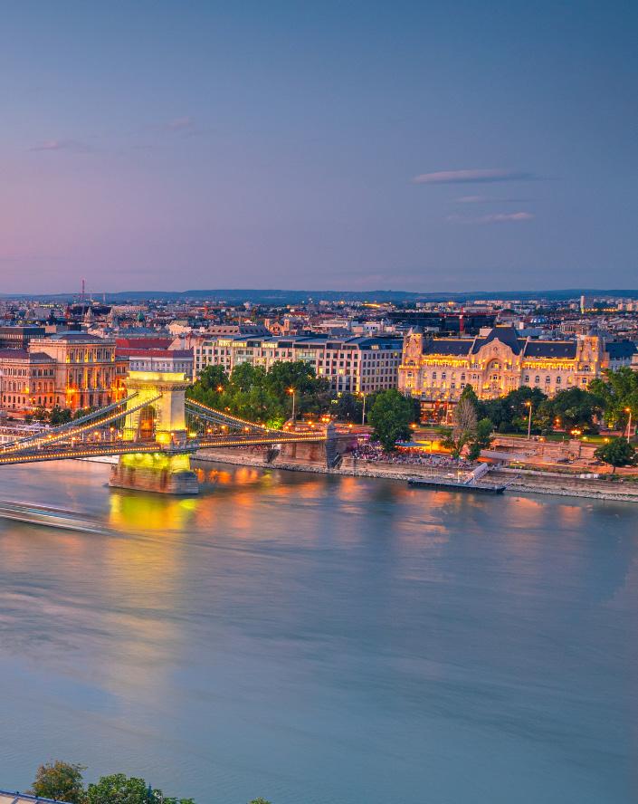 El **río Danubio** es el corazón de Budapest y la divide en dos mitades: la histórica Buda, en la orilla oeste, y la vibrante Pest, en la este. Atravesando diez países, el Danubio es el segundo río más largo de Europa, pero es en Budapest donde revela algunas de sus vistas más emblemáticas. Desde sus orillas, los visitantes pueden contemplar imponentes monumentos como el Parlamento húngaro, el Castillo de Buda y la colina Gellért, todos bellamente iluminados por la noche, lo que convierte un crucero por el Danubio en una de las experiencias más populares de la ciudad. Cruzando este legendario río se encuentra el **Puente de las Cadenas Széchenyi**, uno de los símbolos más preciados de Budapest. Finalizado en 1849, fue el primer puente permanente que unió Buda y Pest, transformando el desarrollo de la ciudad