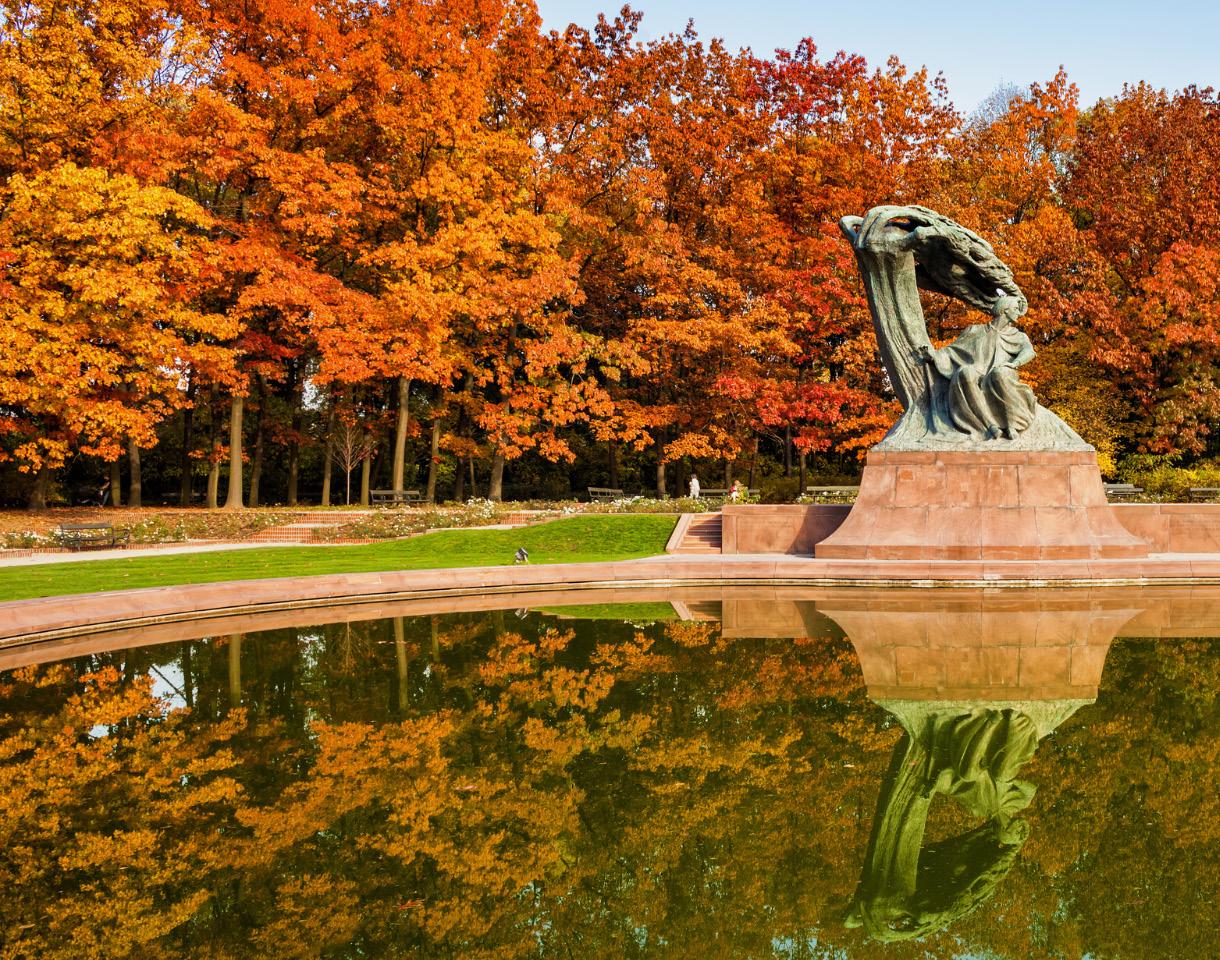El Parque Łazienki, ubicado en el corazón de Varsovia, es uno de los parques urbanos más bellos y extensos de Polonia, con una extensión de más de 76 hectáreas. Fundado en el siglo XVII y rediseñado en el siglo XVIII bajo la dirección del último rey de Polonia, Estanislao Augusto Poniatowski, el parque combina impresionantes paisajes naturales con una elegante arquitectura, convirtiéndolo en un refugio predilecto tanto para residentes como para turistas. En el centro del Parque Łazienki se encuentra el Palacio de la Isla, una joya neoclásica situada junto a un lago artificial. Originalmente un pabellón de baño, fue transformado por el rey Estanislao en su residencia de verano y ahora sirve como museo que exhibe muebles y obras de arte de la época. El reflejo del