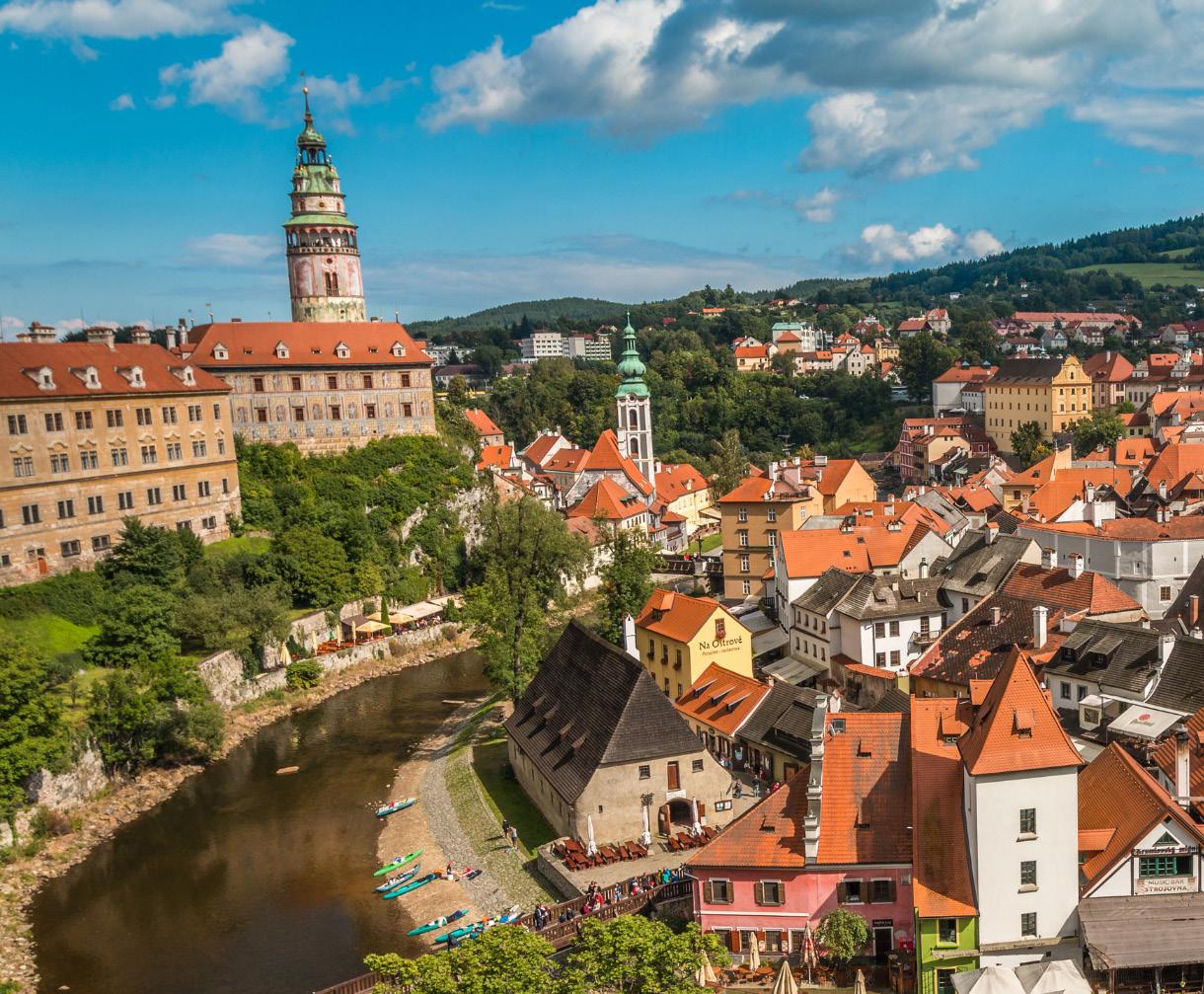 **Český Krumlov** es una pintoresca ciudad de la región de Bohemia Meridional de la República Checa, famosa por su encanto de cuento de hadas y su arquitectura medieval bien conservada. Situado a orillas del sinuoso río Moldava, su centro histórico es Patrimonio de la Humanidad por la UNESCO y famoso por sus edificios góticos, renacentistas y barrocos. En el corazón de Český Krumlov se encuentra su emblemático **complejo del castillo**, el segundo más grande de la República Checa, después del Castillo de Praga. Construido entre los siglos XIII y XVII, el castillo presume de una mezcla única de estilos arquitectónicos, incluyendo una impresionante torre renacentista que ofrece vistas panorámicas de la ciudad y el paisaje circundante. Los terrenos del castillo también albergan un teatro barroco y