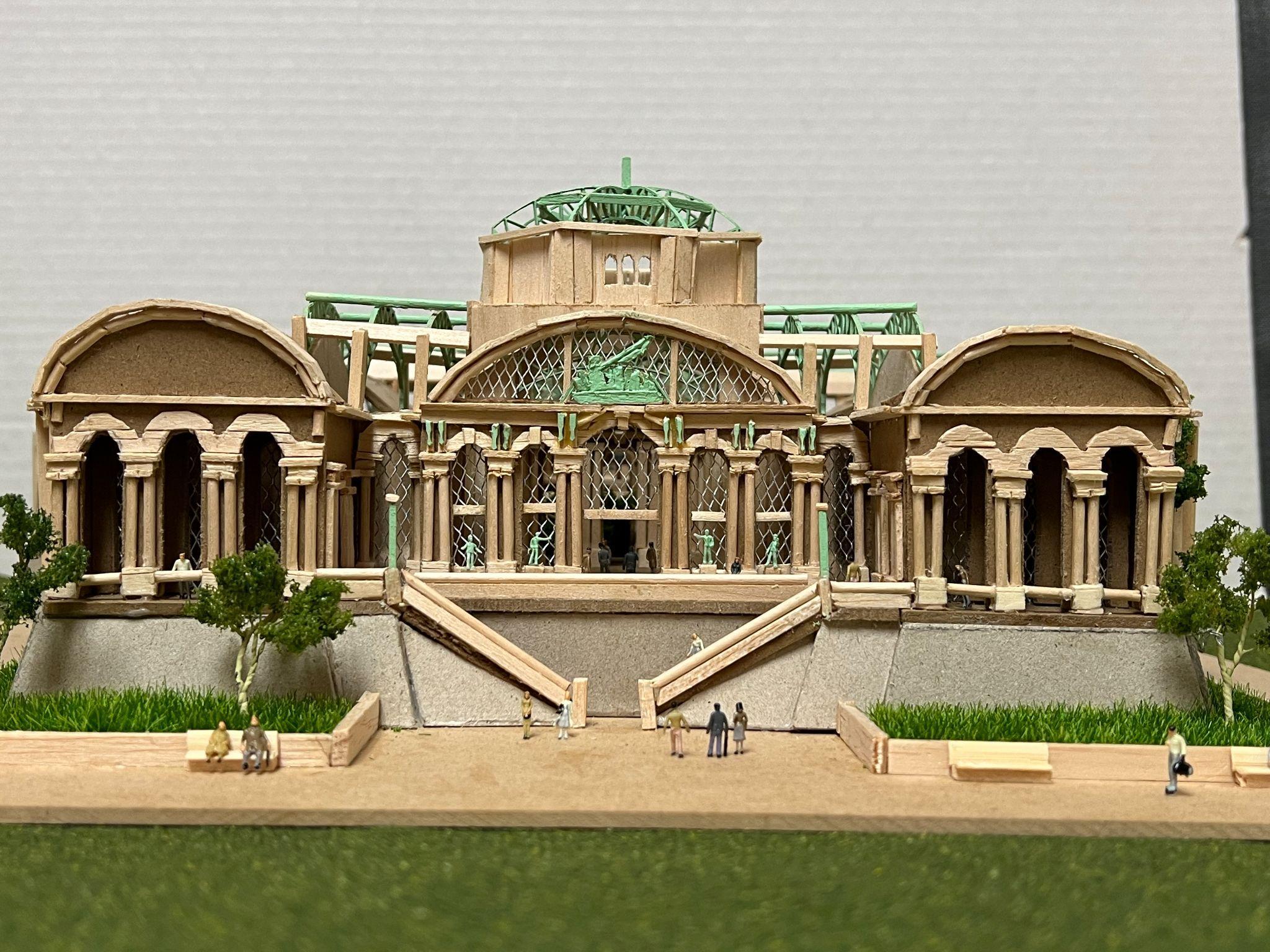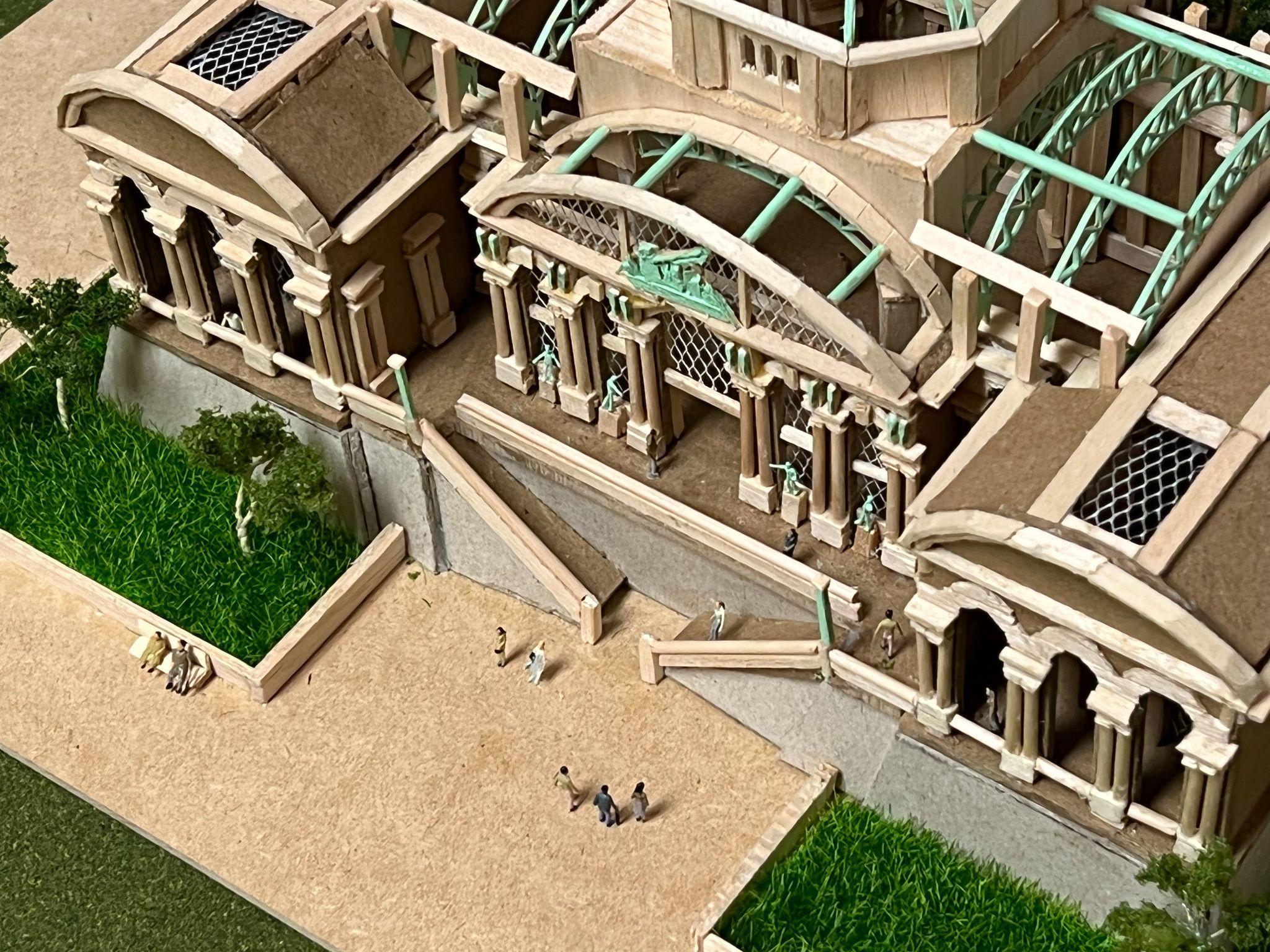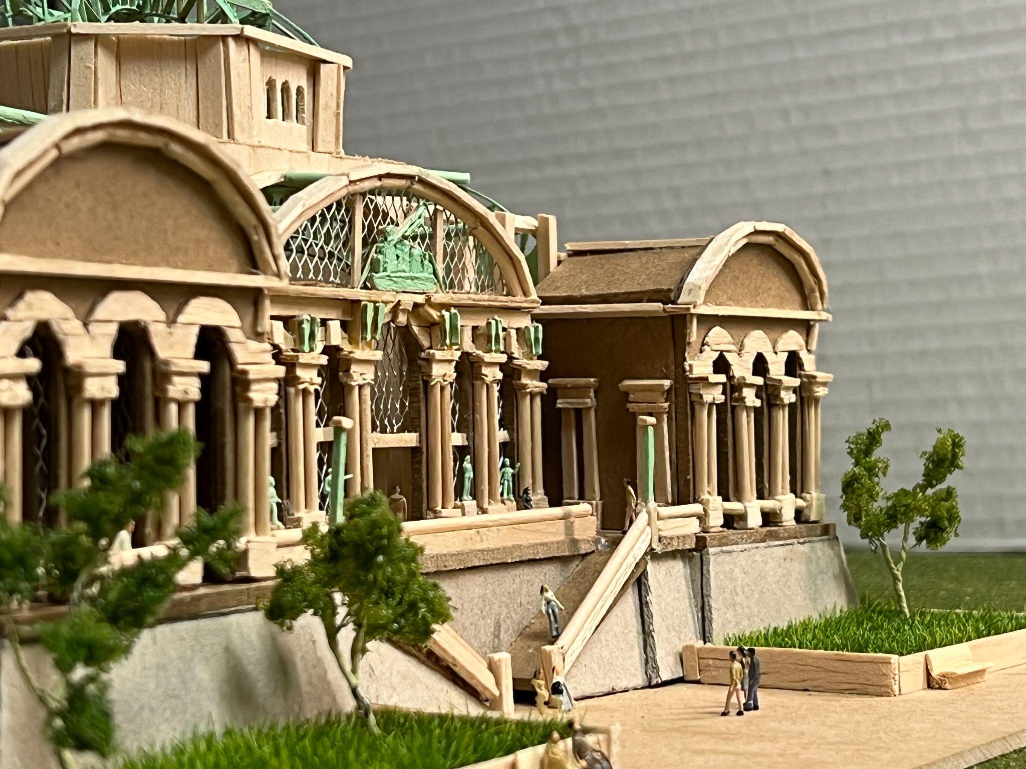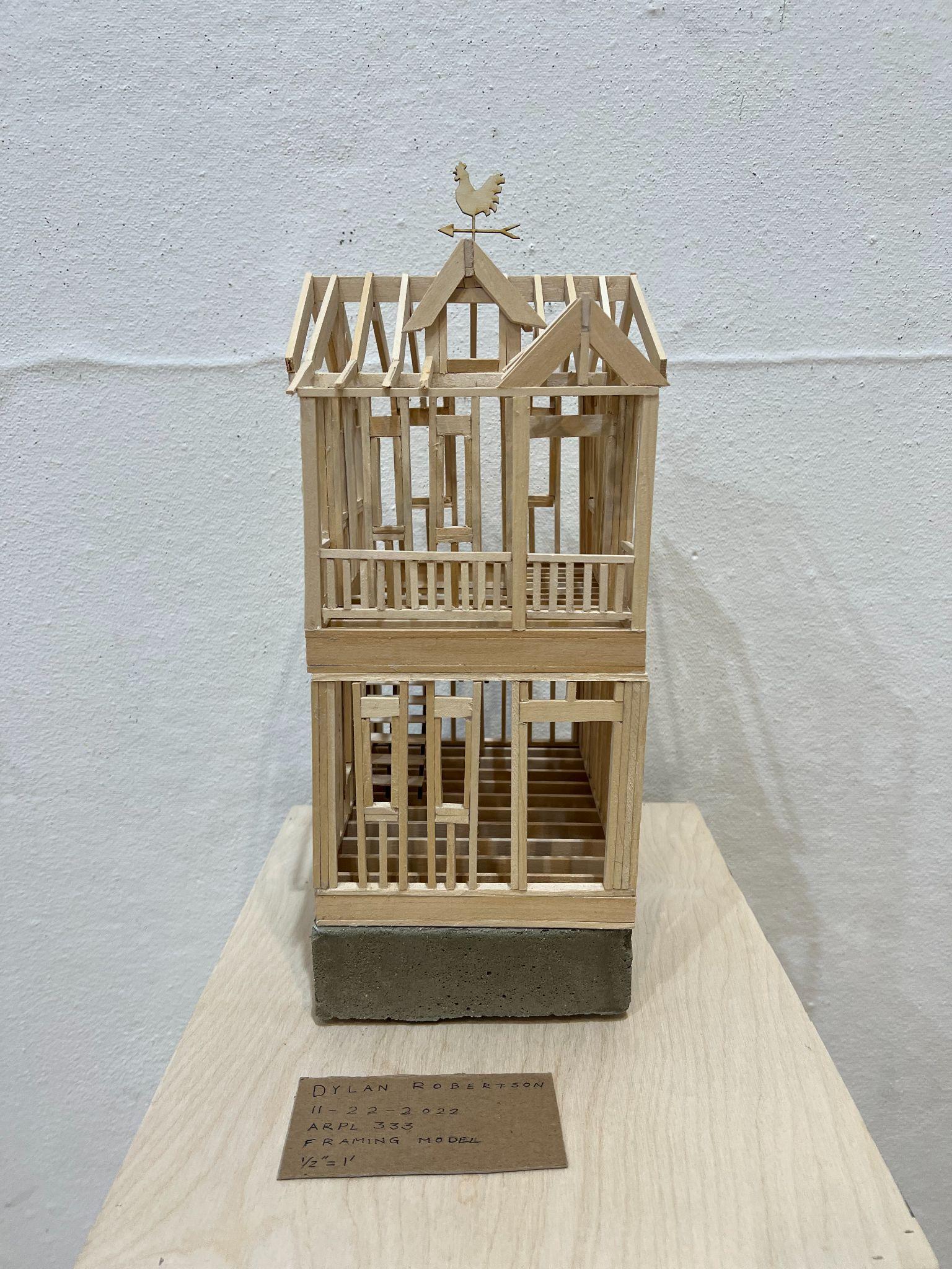 This model was made first in cad then assembled with wood at ½”=1’ scale to represent 2x members for wood framing. Systems of framing are represented including, joists, studs, headers, & sill plates. The house sits on a concrete foundation made with fine grain quikrete.