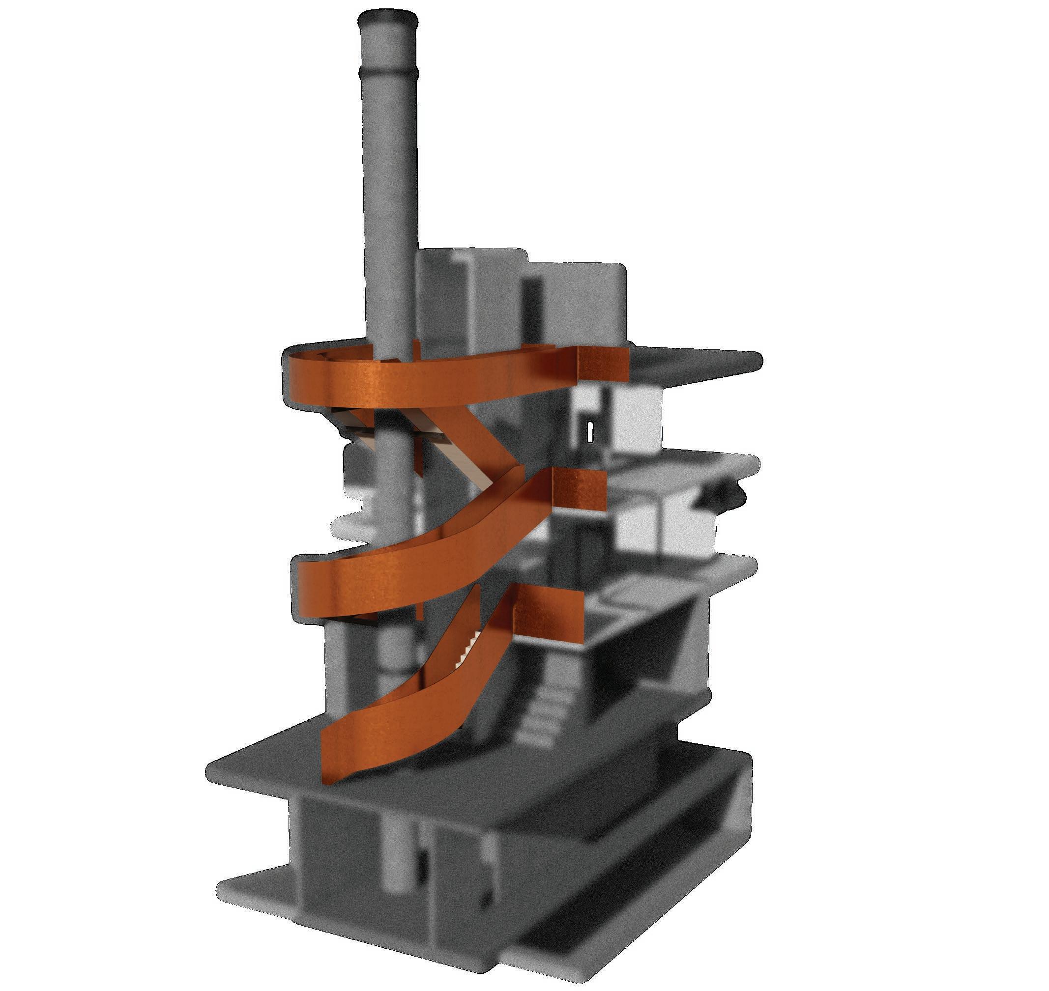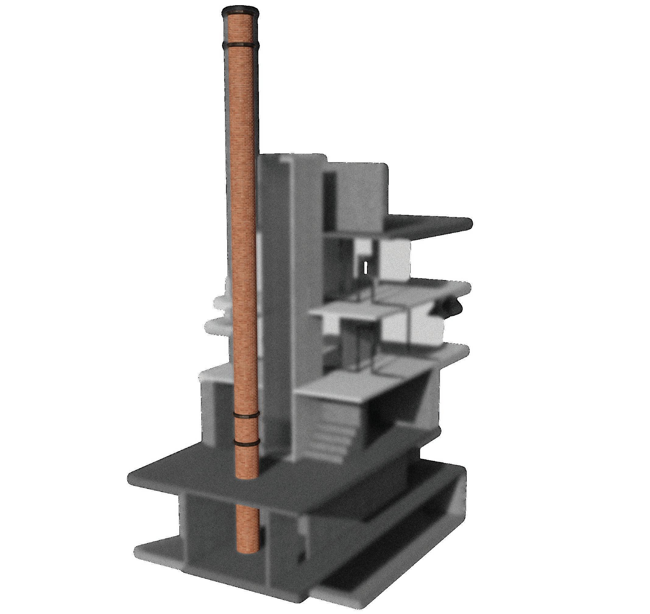 The stairs importantly allow for circulation that surrounds the monumental chimney feature. Both the deceased and mourners make their way up and down inside, outside and around the chimney, marking a sentimental conceptual journey that emotionally connects both groups. Leaning on the chimney for support, the stairs become a sculptural object as well as one of the only parts of the building that is touched.