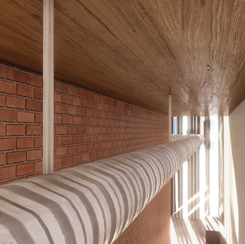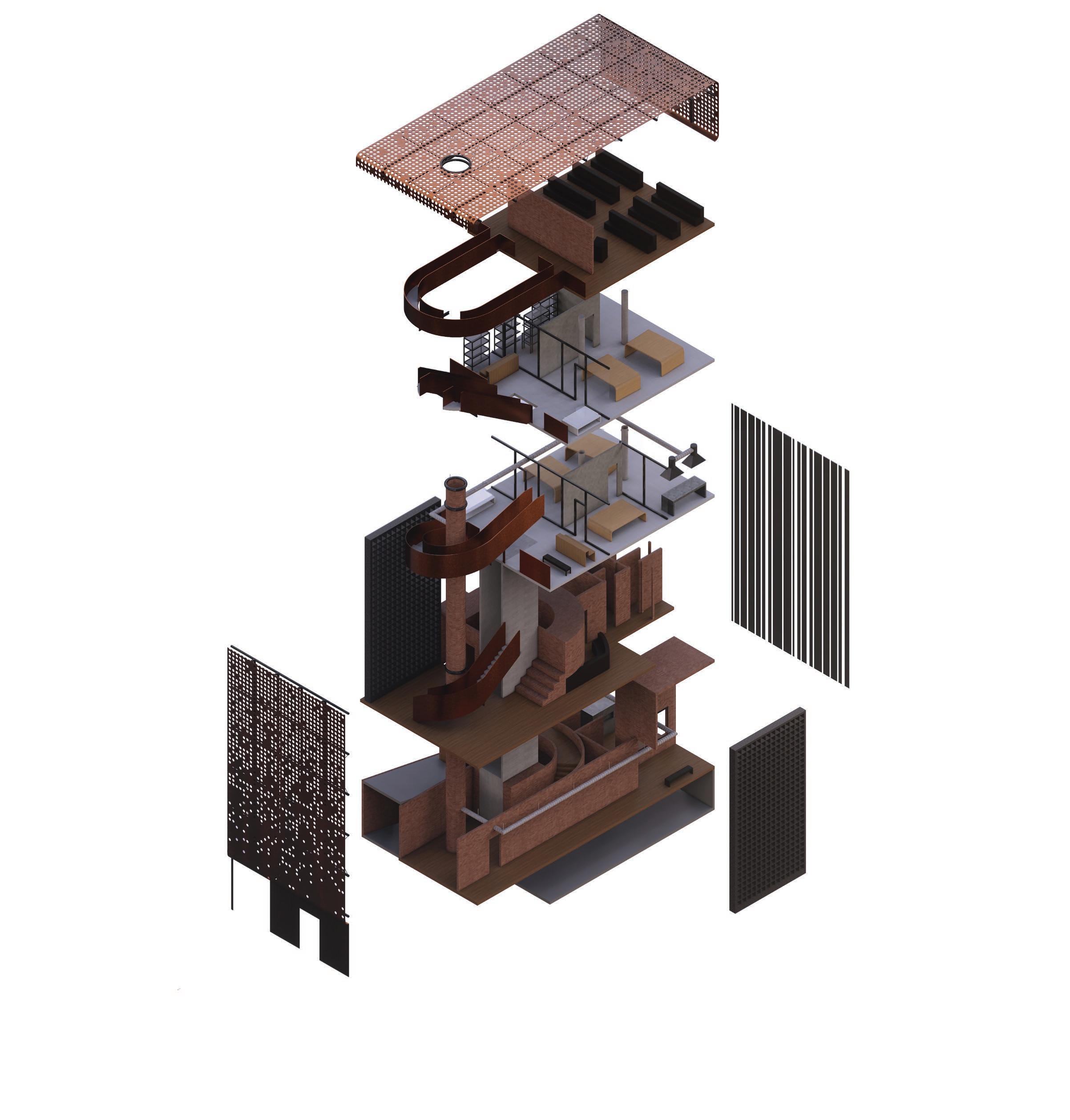 These two reformed programs intersect and complement one another, a common thread of sentimentality expressed through the space they share, its circulatory arrangement and an organic materiality a triumphant representation of transformation and monumentality, as a decisive rejection of sterile architectures.