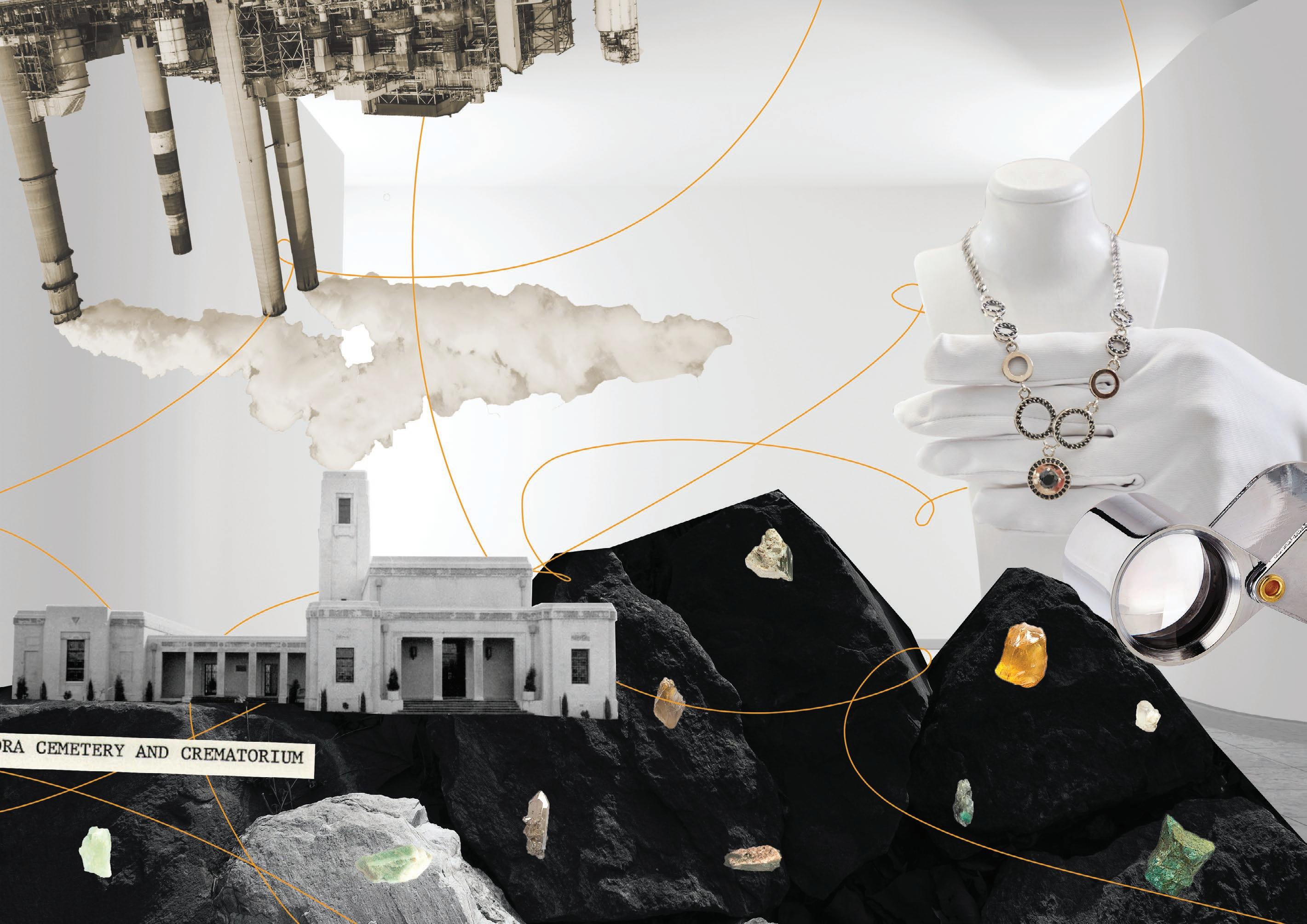 In contemporary times, both programs of crematorium and jewellery maker have fallen victim to a rising tide of commodification, with a focus on function, sterility and mass production. Any meaning on the individual human scale has been lost. In essence, they share the same pollutive output, as represented on the collage. While jewellery maintains a disposition of lightness, delicacy and elegance, the circumstances of cremation remain grounded, and earthly. Interestingly, sharing and ending up at the same origin as many of the gemstones that end up in jewellery.