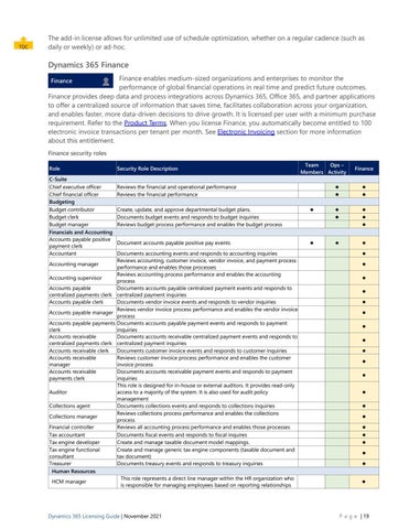 Dynamics 365 Finance Finance enables medium-sized organizations and enterprises to monitor the performance of global financial operations in real time and predict future outcomes. Finance provides deep data and process integrations across Dynamics 365, Office 365, and partner applications to offer a centralized source of information that saves time, facilitates collaboration across your organization, and enables faster, more data-driven decisions to drive growth. It is licensed per user with a minimum purchase requirement. Refer to the Product Terms. When you license Finance, you automatically become entitled to 100 electronic invoice transactions per tenant per month. See Electronic Invoicing section for more information about this entitlement. Finance security roles Role C-Suite Chief executive officer Chief financial officer Budgeting Budget contributor Budget clerk Budget manager Financials and Accounting Accounts payable positive payment clerk Accountant Accounting manager Accounting supervisor Accounts payable centralized payments clerk Accounts payable clerk Accounts payable manager Accounts payable payments clerk Accounts receivable centralized payments clerk Accounts receivable clerk Accounts receivable manager Accounts receivable payments clerk Auditor Collections agent Collections manager Financial controller Tax accountant Tax engine developer Tax engine functional consultant Treasurer Human Resources HCM manager