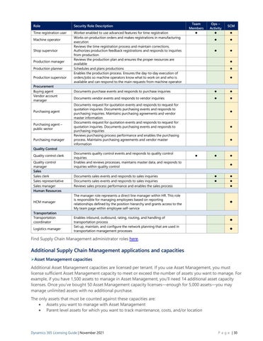 Additional Supply Chain Management applications and capacities ➢Asset Management capacities Additional Asset Management capacities are licensed per tenant. If you use Asset Management, you must license sufficient Asset Management capacity to meet or exceed the number of assets you want to manage. For example, if you have 1,500 assets to manage in Asset Management, you’ll need 14 additional asset capacity licenses. Once you’ve bought 50 Asset Management capacity licenses—enough for 5,000 assets—you may manage unlimited assets with no additional purchase. The only assets that must be counted against these capacities are: • Assets you want to manage with Asset Management • Parent level assets for which you want to track maintenance, costs, and/or location