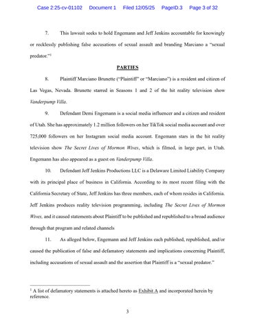 2. After flirting with and kissing Plaintiff Marciano Brunette while filming the reality television show Vanderpump Villa in August 2024, Defendant Demi Engemann, a self-described “influencer” and star of the Utah-based reality television show The Secret Lives of Mormon Wives,