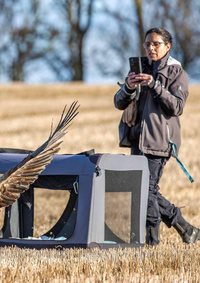 Michelle Braganza og de to kredsformænd i Ringkøbing, Michael Jensen og Alex Termansen, som var ude at hente den meget forkomne havørn, der væltede sløvt rundt på en mark uden at kunne komme på vingerne. De to kredsformænd kørte havørnen til Kalenderkvarterets Vildtplejestation, hvor den med kyndig pleje kom til hægterne og begyndte at spise igen. Efter nogle dage kunne Michelle Braganza sætte havørnen fri ude på findestedet.