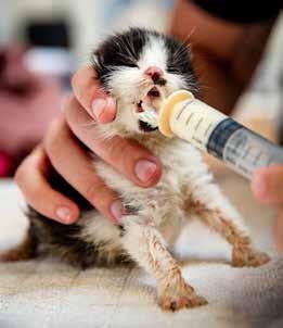 Det er tid til fodring, og Laura Bay tager den første killing op fra kassen. Den piber insisterende og spjætter med sin lille krop. Hun fylder en sprøjte med 10 milliliter modermælkserstatning og sætter en lille dietud for enden: