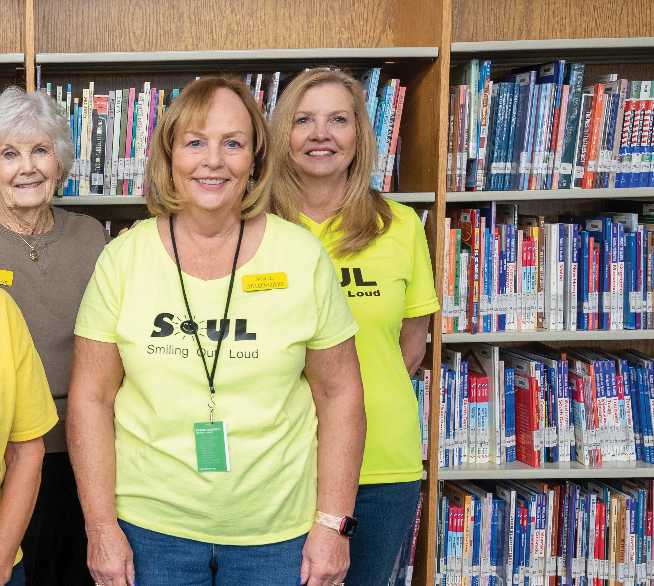 Members of SOuL help a student check out a book at Thompson Ranch Elementary School. After helping rearrange the library for this school year, the ladies continued to volunteer and now help teachers when students check out books to take home.