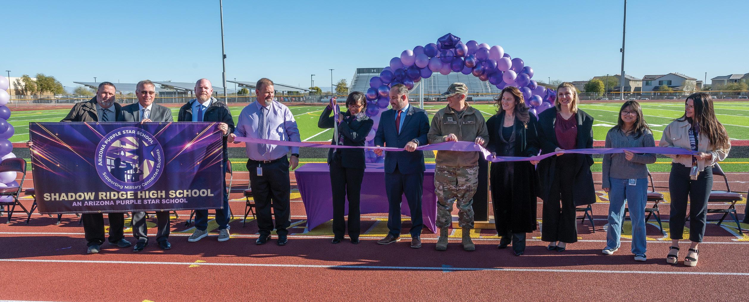 Leadership from the Dysart Unified School District, Shadow Ridge High School, Luke Air Force Base, and the City of Surprise cut the ribbon during a ceremony celebrating the Purple Star School designation for Shadow Ridge in January.