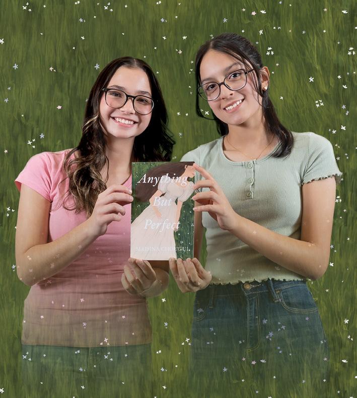 Madina Chougui (left) and Jocelyn Sanchez (right), both 8th graders at Luke Elementary School, pose with their selfpublished novel, “Anything But Perfect.”