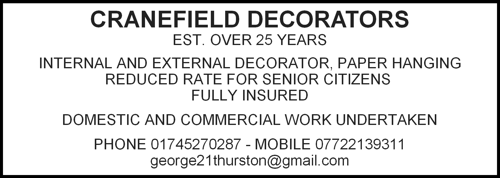 CRANEFIELD DECORATORSEST. OVER 25 YEARS INTERNAL AND EXTERNAL DECORATOR, PAPER HANGINGREDUCED RATE FOR SENIOR CITIZENSFULLY INSURED DOMESTIC AND COMMERCIAL WORK UNDERTAKENPHONE 01745 270287 – MOBILE 07722 139 311 george21thurston@gmail.com