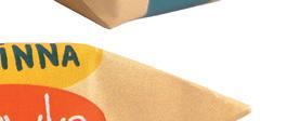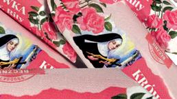 Każda krówka, ręcznie krojona, została specjalnie opakowana w wewnętrzny, biały papierek umożliwiający łatwe odwijanie oraz zewnętrzny, kredowany z sentencją od świętej Rity.