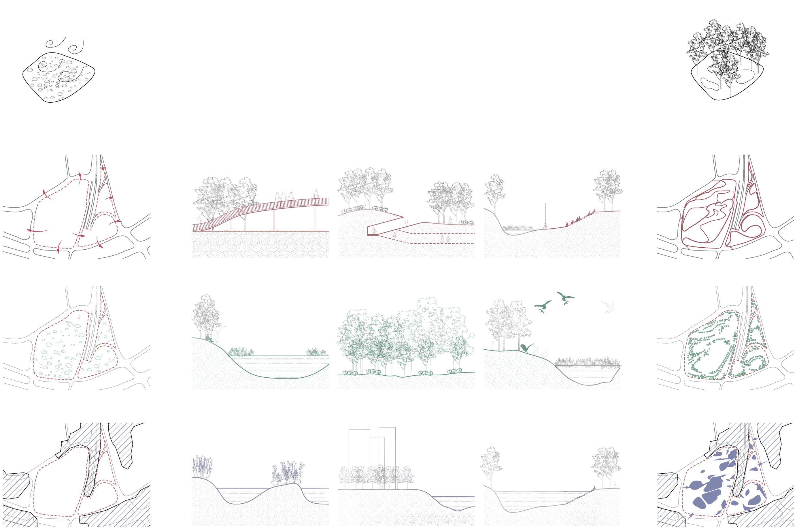 For my site, a long section of the lower reaches of the Jialing River, I designed a multi-layered fish-eye pond system along the river with reference to the replicability and modularity of the use of the base pond system, which can be used to expose different areas of land for human activities with the rise and fall of the water level, as well as configuring slope stabilisation and restoration plants based on the characteristics of the different water levels of inundation, and according to the tolerance of the water level and the seasonal habit of growth.
