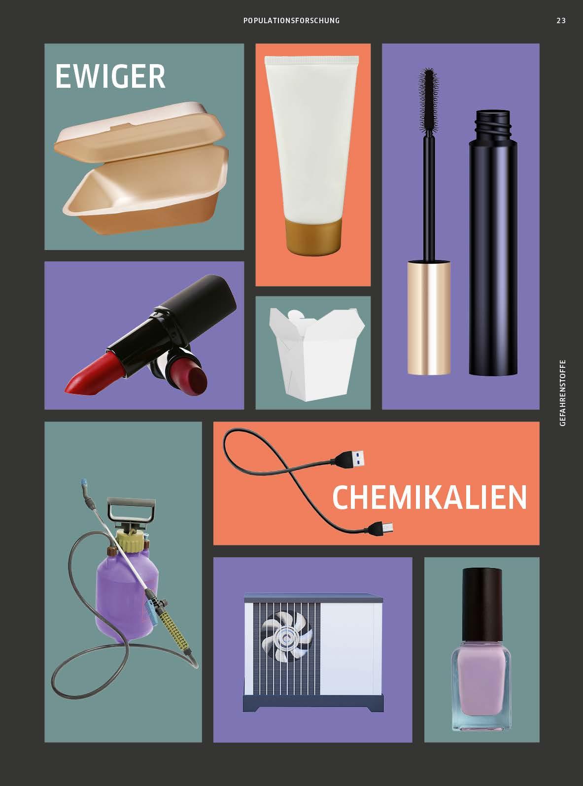 Schätzungsweise zwei Drittel der chronischen, nicht übertragbaren Krankheiten sind auf die Auswirkungen des Exposoms zurückzuführen. Professor Thomas Münzel, Studienleiter beim Deutschen Zentrum für Herz-Kreislauf-Forschung (DZHK) und Seniorprofessor am Zentrum für Kardiologie der Universitätsmedizin Mainz, hat in Studien nachgewiesen, dass etwa Luftverschmutzung zu den größten Gesundheitsgefahren gehört und für 8,8 Millionen vorzeitige Todesfälle pro Jahr verantwortlich ist (siehe Artikel ab Seite 34). Er wünscht sich, dass das Exposom entsprechend mehr Beachtung ndet: „Es sorgt mit seinen vielfältigen Belastungen im Lebensverlauf für starke gesundheitliche Auswirkungen und vorzeitige Todesfälle. Deshalb sollte die Forschung dazu dringend intensiviert werden.“ #