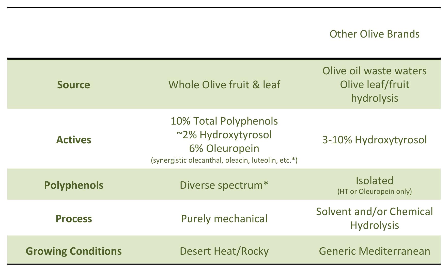 TruOliv™ stands out from its competitors as it is not sourced from the ‘waste-water’ byproducts of olive oil production, nor chemical hydrolysis or solvent processes, which tend to favor high concentrations of single polyphenols over the research-proven benefits of a synergistic profile. At 10% polyphenols (total), ~ 2% hydroxytyrosol, 6% oleuropein, and measurable amounts of synergistic phenols (i.e. oleacin, olecanthal, luteolin, etc.), TruOliv™ is truly unmatched in quality and clinical potential.