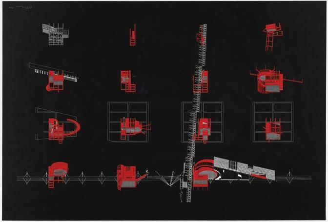 Bernard Tschumi. (1986) Parc de la Villette, Paris, France [Follies and Galleries, isometrics]