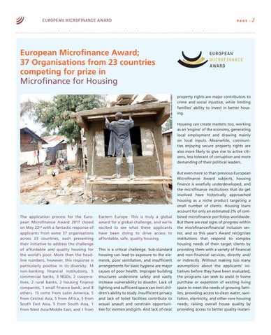 European Microfinance Award; 37 Organisations from 23 countries competing for prize in Microfinance for Housing property rights are major contributors to crime and social injustice, while limiting families’ ability to invest in better housing. Housing can create markets too, working as an ‘engine’ of the economy, generating local employment and drawing mainly on local inputs. Meanwhile, communities enjoying secure property rights are also more likely to give rise to active citizens, less tolerant of corruption and more demanding of their political leaders.