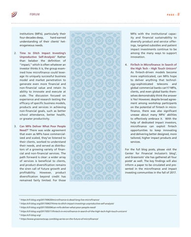 institutions (MFIs), particularly their four-decades-deep, hard-earned understanding of their clients’ heterogeneous needs. 2. Time to Ditch Impact Investing’s Unproductive Self-Analysis2 Rather than belabor the definition of “impact,” which is often whatever an investor thinks it is, the group examined how microfinance could leverage its uniquely successful business model and market penetration to generate even more financial and non-financial value and retain its ability to innovate and execute at scale. The discussion focused on experience and research testing the efficacy of specific business models, products and services in achieving non-financial goals, such as better school attendance, better health, or greater productivity. 3. Can MFIs Deliver What Poor People Need?3 There was wide agreement that even as MFIs have commercialized and scaled, they’ve listened to their clients, worked to understand their needs, and served as distributors of a growing variety of financial and non-financial services. The path forward is clear: a wider array of services is beneficial to clients, and product diversification remains the siren call of future growth and profitability. However, product diversification beyond credit has remained fairly limited. For those