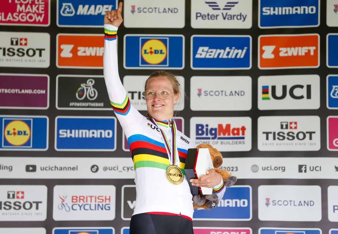 I målområdet var det hektisk og overvældende. Konkurrenter flokkedes for at ønske tillykke, mens fotografer og journalister stak kameraer og diktafoner op i ansigtet på den overraskende verdensmester. Familien, hendes forældre, kæreste, søster og svoger omfavnede hende, før UCI-officials gennede hende til dopingkontrol.